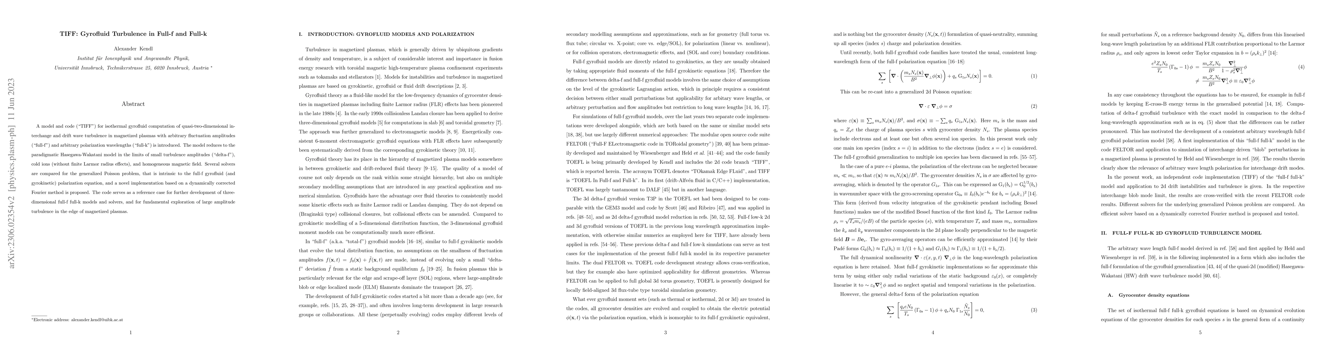 This paper introduces TIFF, a model and code for simulating gyrofluid turbulence in magnetized plasmas, capable of handling full-f and full-k fluctuation amplitudes. It proposes a new solver for the generalized Poisson problem and serves as a foundation for future three-dimensional models and studies of turbulence in plasma edges.