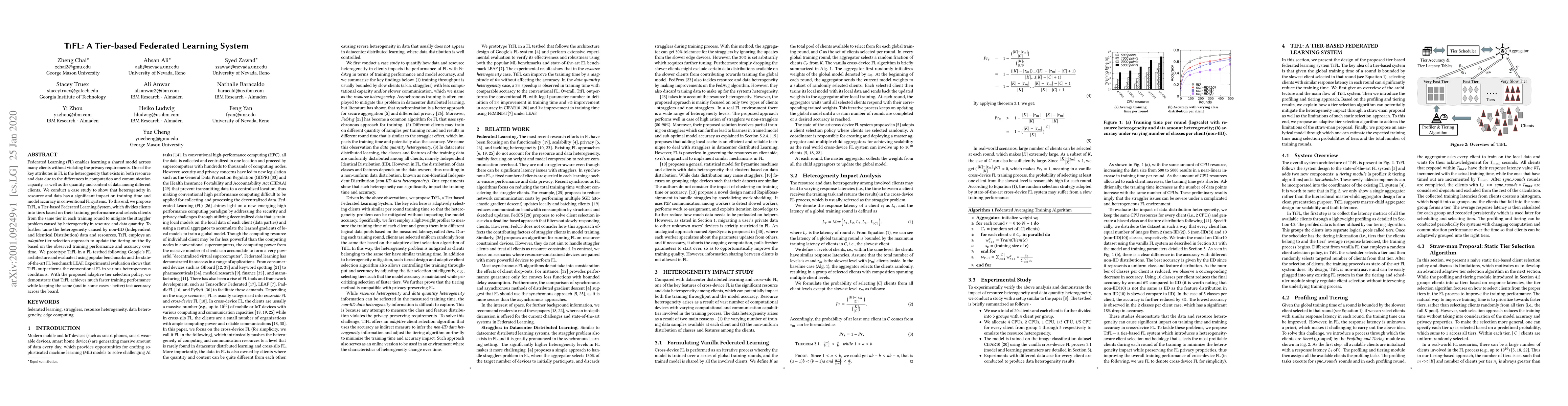 TiFL is a Tier-based Federated Learning System designed to address the challenges of resource and data heterogeneity in FL, improving training time and model accuracy. It divides clients into tiers based on performance and employs adaptive tier selection to optimize training efficiency and accuracy.
