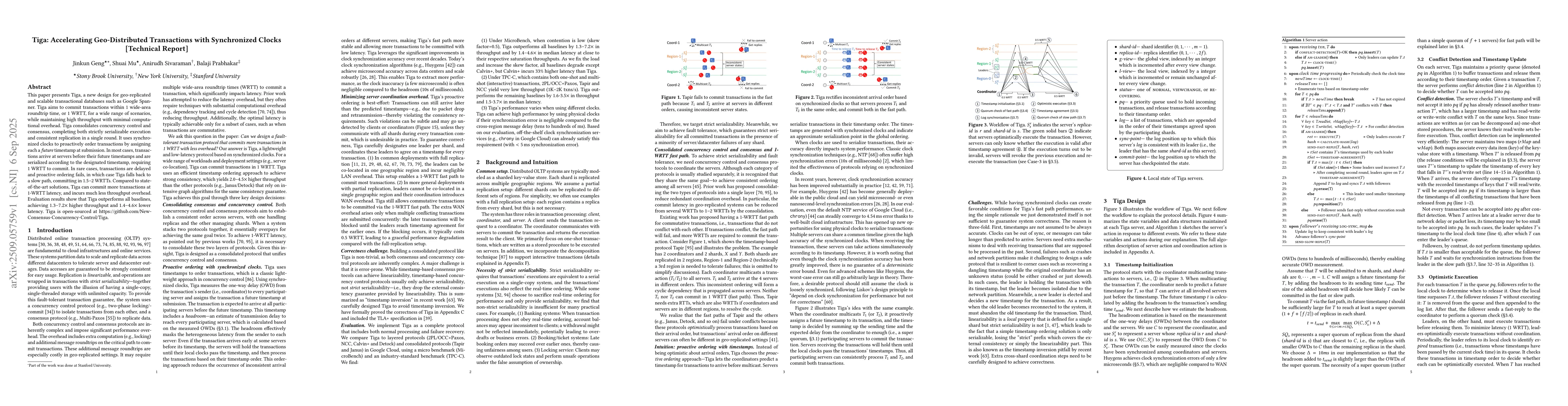 This paper presents Tiga, a new design for geo-replicated and scalable transactional databases such as Google Spanner. Tiga aims to commit transactions within 1 wide-area roundtrip time, or 1 WRTT, for a wide range of scenarios, while maintaining high throughput with minimal computational overhead. Tiga consolidates concurrency control and consensus, completing both strictly serializable execution and consistent replication in a single round. It uses synchronized clocks to proactively order transactions by assigning each a future timestamp at submission. In most cases, transactions arrive at servers before their future timestamps and are serialized according to the designated timestamp, requiring 1 WRTT to commit. In rare cases, transactions are delayed and proactive ordering fails, in which case Tiga falls back to a slow path, committing in 1.5--2 WRTTs. Compared to state-of-the-art solutions, Tiga can commit more transactions at 1-WRTT latency, and incurs much less throughput overhead. Evaluation results show that Tiga outperforms all baselines, achieving 1.3--7.2$\times$ higher throughput and 1.4--4.6$\times$ lower latency. Tiga is open-sourced at https://github.com/New-Consensus-Concurrency-Control/Tiga.