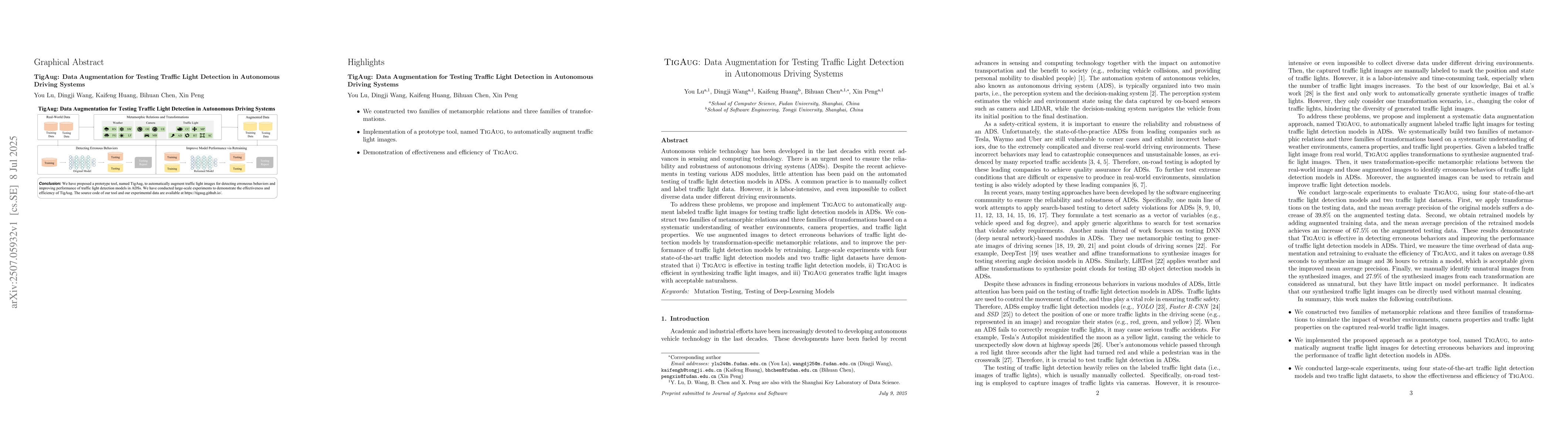 Autonomous vehicle technology has been developed in the last decades with recent advances in sensing and computing technology. There is an urgent need to ensure the reliability and robustness of autonomous driving systems (ADSs). Despite the recent achievements in testing various ADS modules, little attention has been paid on the automated testing of traffic light detection models in ADSs. A common practice is to manually collect and label traffic light data. However, it is labor-intensive, and even impossible to collect diverse data under different driving environments. To address these problems, we propose and implement TigAug to automatically augment labeled traffic light images for testing traffic light detection models in ADSs. We construct two families of metamorphic relations and three families of transformations based on a systematic understanding of weather environments, camera properties, and traffic light properties. We use augmented images to detect erroneous behaviors of traffic light detection models by transformation-specific metamorphic relations, and to improve the performance of traffic light detection models by retraining. Large-scale experiments with four state-of-the-art traffic light detection models and two traffic light datasets have demonstrated that i) TigAug is effective in testing traffic light detection models, ii) TigAug is efficient in synthesizing traffic light images, and iii) TigAug generates traffic light images with acceptable naturalness.