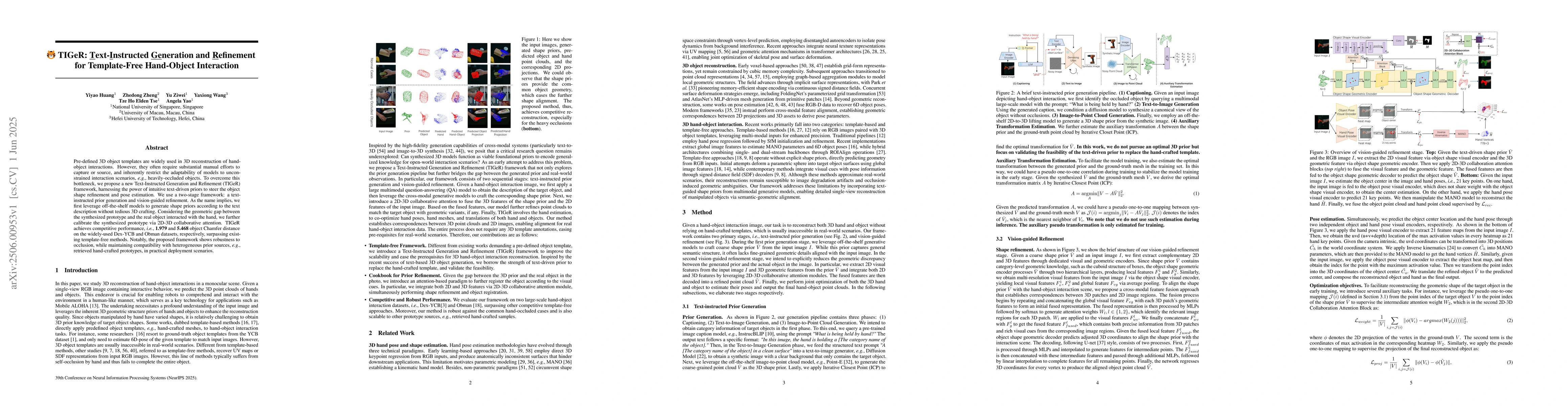 Pre-defined 3D object templates are widely used in 3D reconstruction of hand-object interactions. However, they often require substantial manual efforts to capture or source, and inherently restrict the adaptability of models to unconstrained interaction scenarios, e.g., heavily-occluded objects. To overcome this bottleneck, we propose a new Text-Instructed Generation and Refinement (TIGeR) framework, harnessing the power of intuitive text-driven priors to steer the object shape refinement and pose estimation. We use a two-stage framework: a text-instructed prior generation and vision-guided refinement. As the name implies, we first leverage off-the-shelf models to generate shape priors according to the text description without tedious 3D crafting. Considering the geometric gap between the synthesized prototype and the real object interacted with the hand, we further calibrate the synthesized prototype via 2D-3D collaborative attention. TIGeR achieves competitive performance, i.e., 1.979 and 5.468 object Chamfer distance on the widely-used Dex-YCB and Obman datasets, respectively, surpassing existing template-free methods. Notably, the proposed framework shows robustness to occlusion, while maintaining compatibility with heterogeneous prior sources, e.g., retrieved hand-crafted prototypes, in practical deployment scenarios.