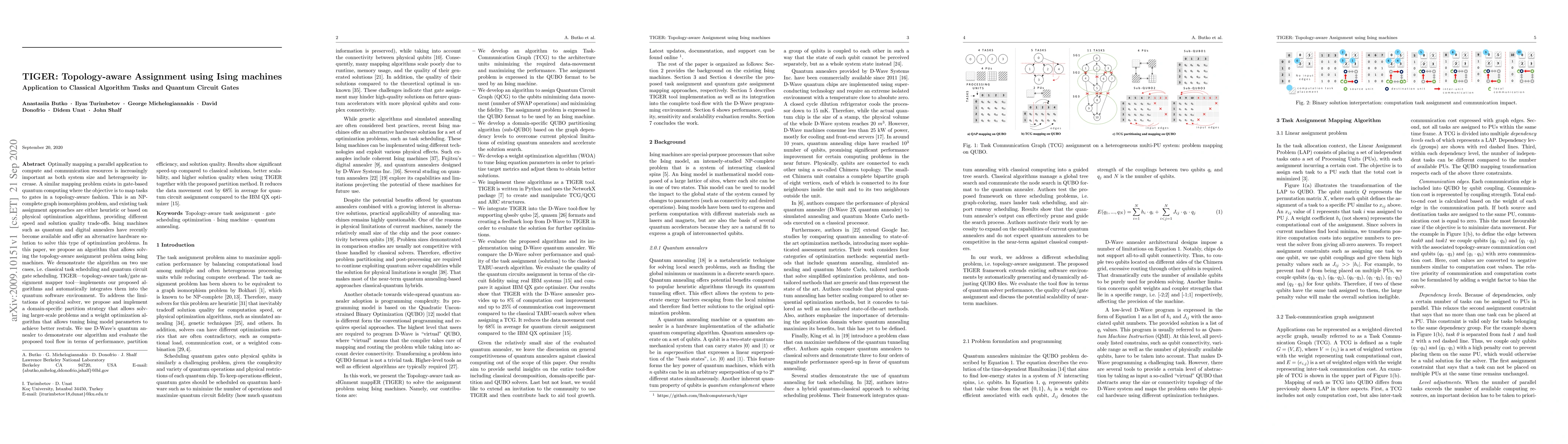 The paper proposes TIGER, an algorithm utilizing Ising machines to solve topology-aware assignment problems in both classical task scheduling and quantum circuit gate scheduling. TIGER integrates these solutions into quantum software environments, showing significant speed-ups, better scalability, and higher solution quality compared to classical methods.