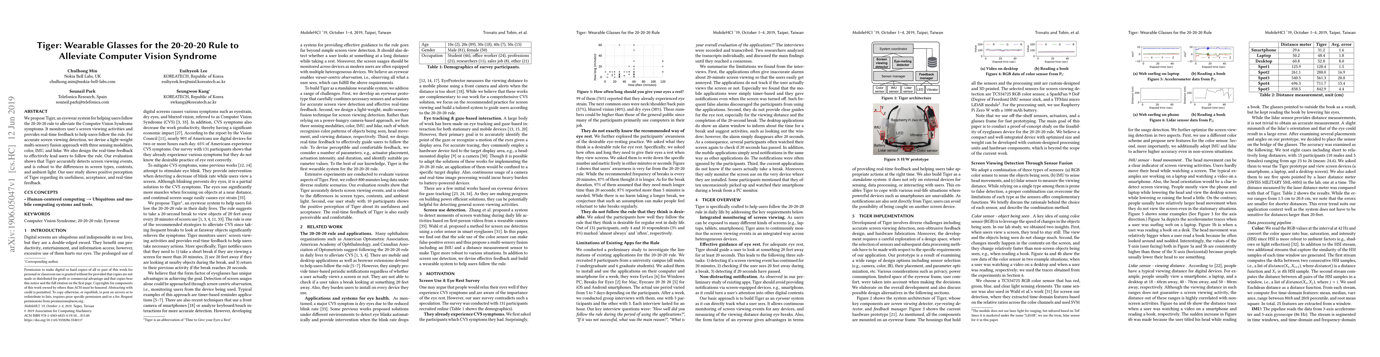 The research introduces Tiger, a wearable eyewear system that uses color, IMU, and lidar sensors to remind users to follow the 20-20-20 rule for reducing Computer Vision Syndrome. Evaluation shows its accuracy in detecting screen viewing and user acceptance of the real-time feedback.