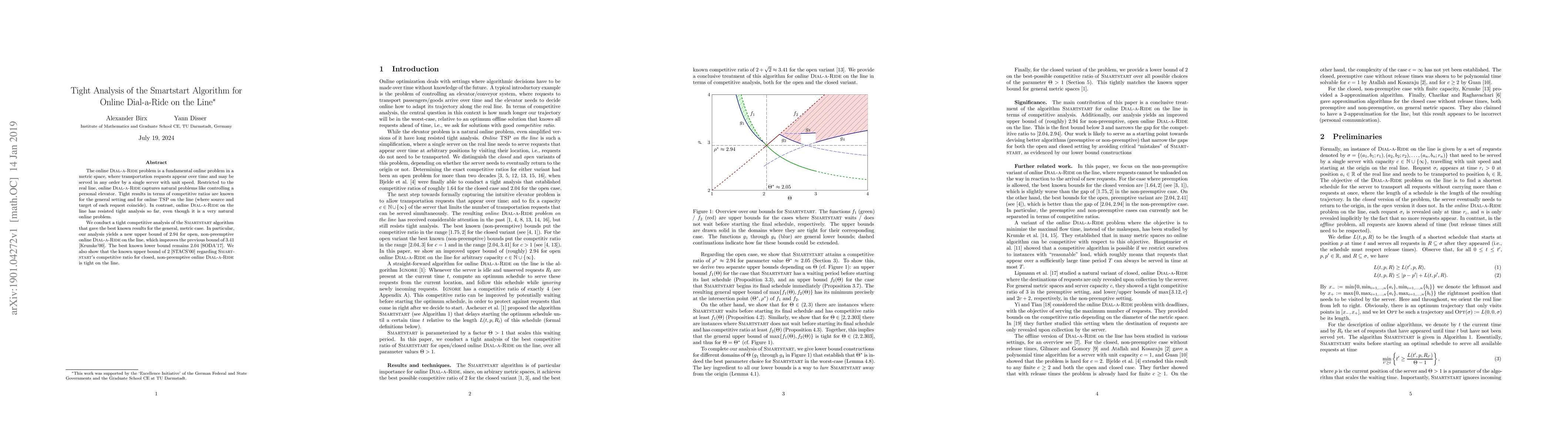 This paper conducts a tight competitive analysis of the Smartstart algorithm for online Dial-a-Ride on the line, achieving an improved upper bound of 2.94, surpassing the previous 3.41 bound, while confirming the known upper bound of 2 for closed requests is tight.