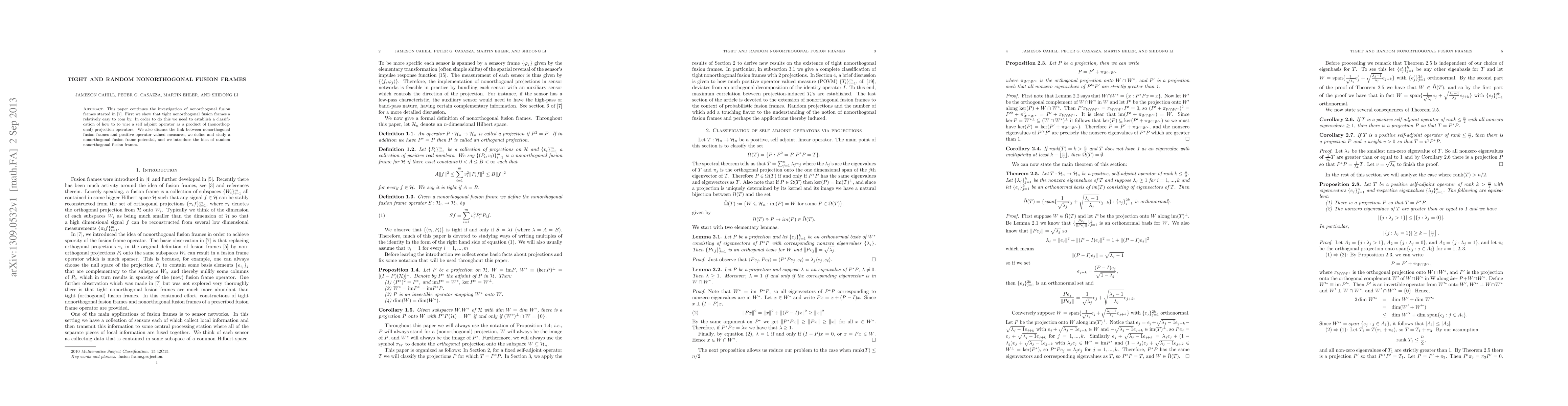 First we show that tight nonorthogonal fusion frames a relatively easy to com by. In order to do this we need to establish a classification of how to to wire a self adjoint operator as a product of (nonorthogonal) projection operators. We also discuss the link between nonorthogonal fusion frames and positive operator valued measures, we define and study a nonorthogonal fusion frame potential, and we introduce the idea of random nonorthogonal fusion frames.