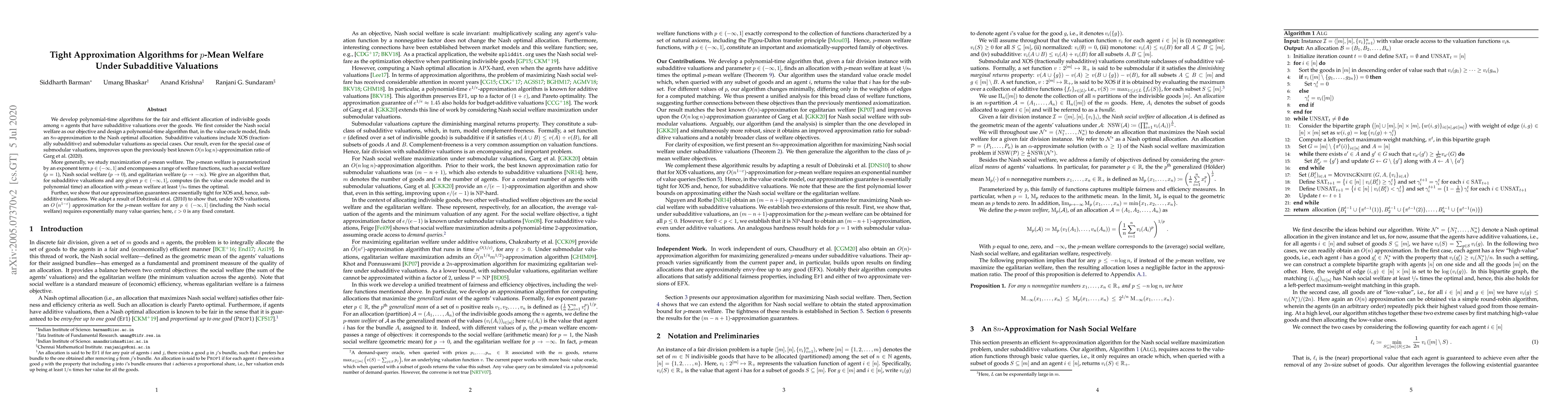 This paper presents polynomial-time algorithms for allocating indivisible goods to agents with subadditive valuations, achieving an $8n$-approximation for Nash social welfare. It also generalizes to $p$-mean welfare maximization, achieving a $\frac{1}{8n}$-approximation, and proves the tightness of these approximations for XOS valuations.