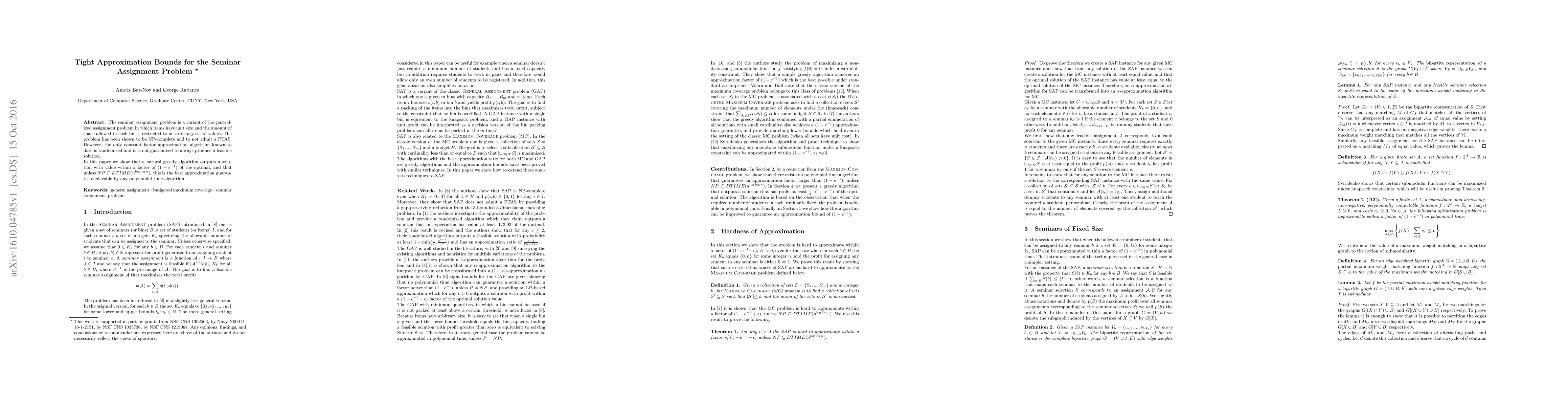 This paper presents a tight approximation algorithm for the seminar assignment problem, demonstrating that a greedy algorithm achieves a $(1 - e^{-1})$ approximation factor. It also proves that no better polynomial-time approximation is possible unless NP problems can be solved in sub-exponential time.