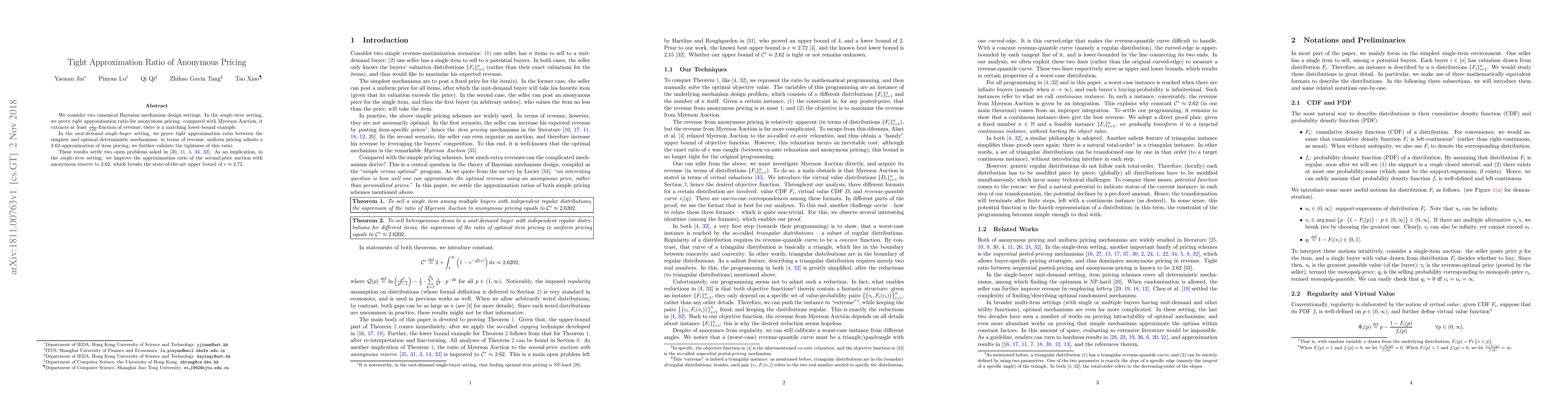 This paper establishes tight approximation ratios for anonymous pricing in two Bayesian mechanism design settings: single-item and unit-demand single-buyer. It shows that anonymous pricing extracts at least $\frac{1}{2.62}$ of the revenue compared to the Myerson Auction, and verifies this ratio with a matching lower bound. For the unit-demand case, it proves uniform pricing achieves a $2.62$-approximation of optimal item pricing, also confirmed by a tight lower bound. These findings resolve open questions in the cited literature and improve the best-known upper bound for the second-price auction with anonymous reserve.