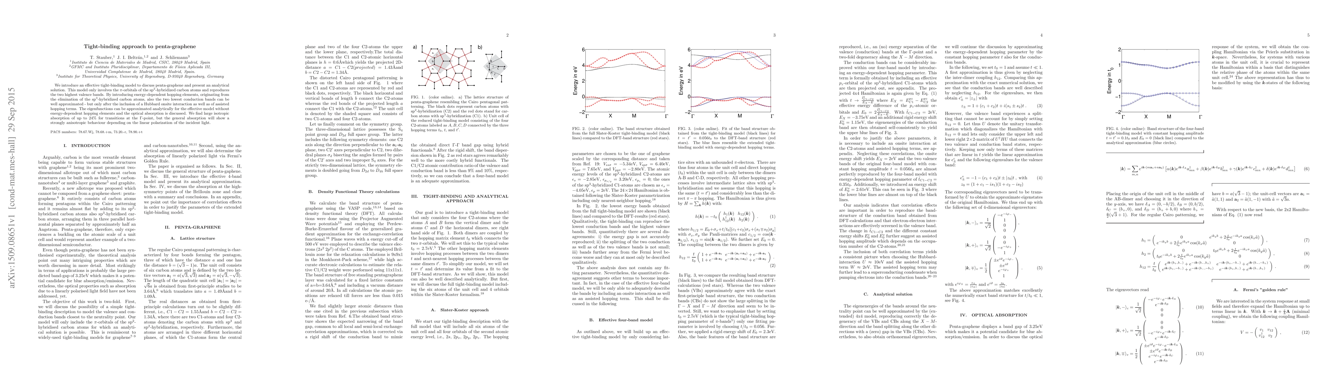 This research introduces a tight-binding model for penta-graphene, involving only sp^2 hybridized carbon u2013 pi orbitals. It reproduces higher valence bands and, with additional terms, approximates lower conduction bands. The study finds large isotropic optical absorption of up to 24% at the u03c0-point, but notes anisotropic absorption depending on light polarization.