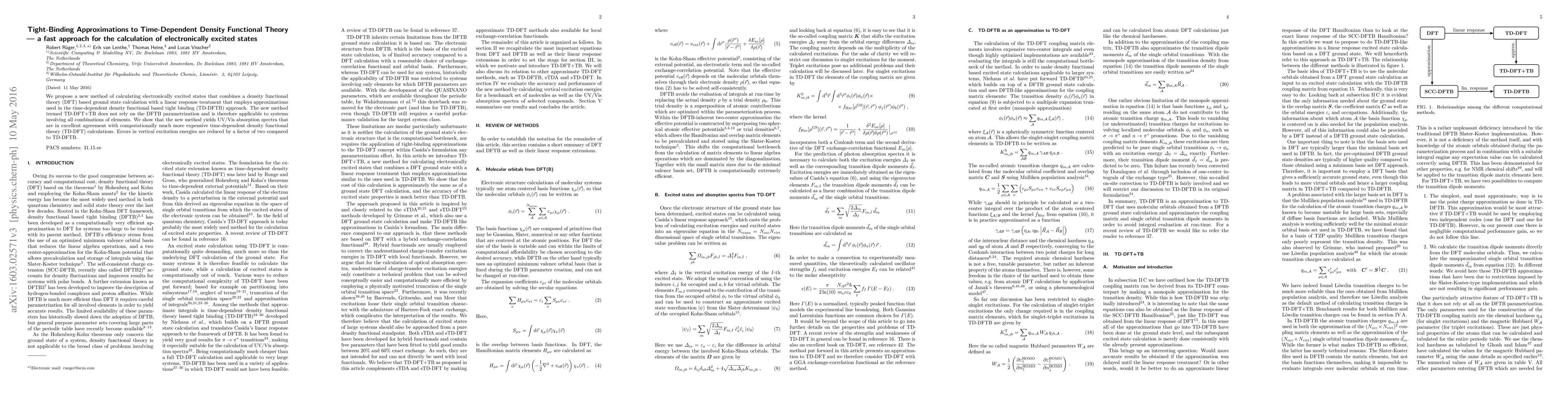 This paper introduces a new method, TD-DFT+TB, for calculating electronically excited states by combining ground state DFT calculations with a linear response treatment based on TD-DFTB approximations. The method is applicable to all element combinations and shows excellent agreement with TD-DFT results, reducing errors in excitation energies by half compared to TD-DFTB.