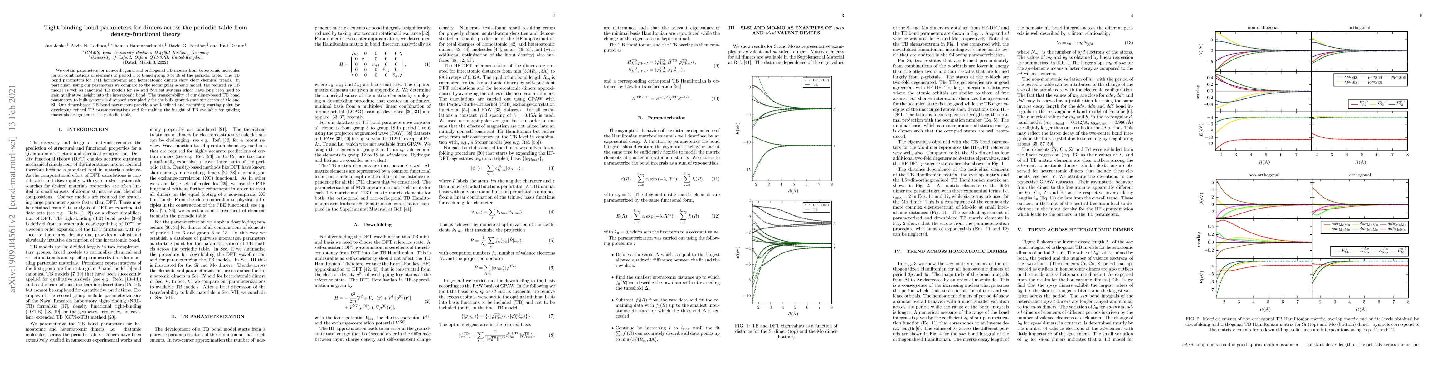 We obtain parameters for non-orthogonal and orthogonal TB models from two-atomic molecules for all combinations of elements of period 1 to 6 and group 3 to 18 of the periodic table. The TB bond parameters for 1711 homoatomic and heteroatomic dimers show clear chemical trends. In particular, using our parameters we compare to the rectangular d-band model, the reduced sp TB model as well as canonical TB models for sp- and d-valent systems which have long been used to gain qualitative insight into the interatomic bond. The transferability of our dimer-based TB bond parameters to bulk systems is discussed exemplarily for the bulk ground-state structures of Mo and Si. Our dimer-based TB bond parameters provide a well-defined and promising starting point for developing refined TB parameterizations and for making the insight of TB available for guiding materials design across the periodic table.