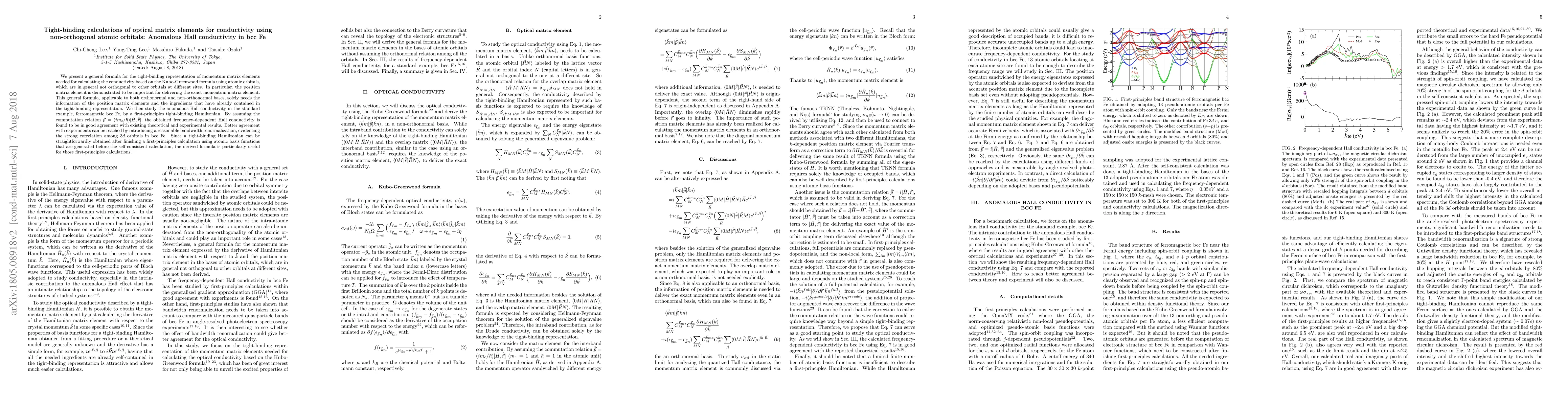 This paper develops a tight-binding formula for optical matrix elements in conductivity calculations using non-orthogonal atomic orbitals, demonstrating its application to the anomalous Hall conductivity in bcc Fe. The derived formula, which incorporates position matrix elements, shows good agreement with theoretical and experimental results for bcc Fe's Hall conductivity, highlighting the importance of bandwidth renormalization for better experimental fit.