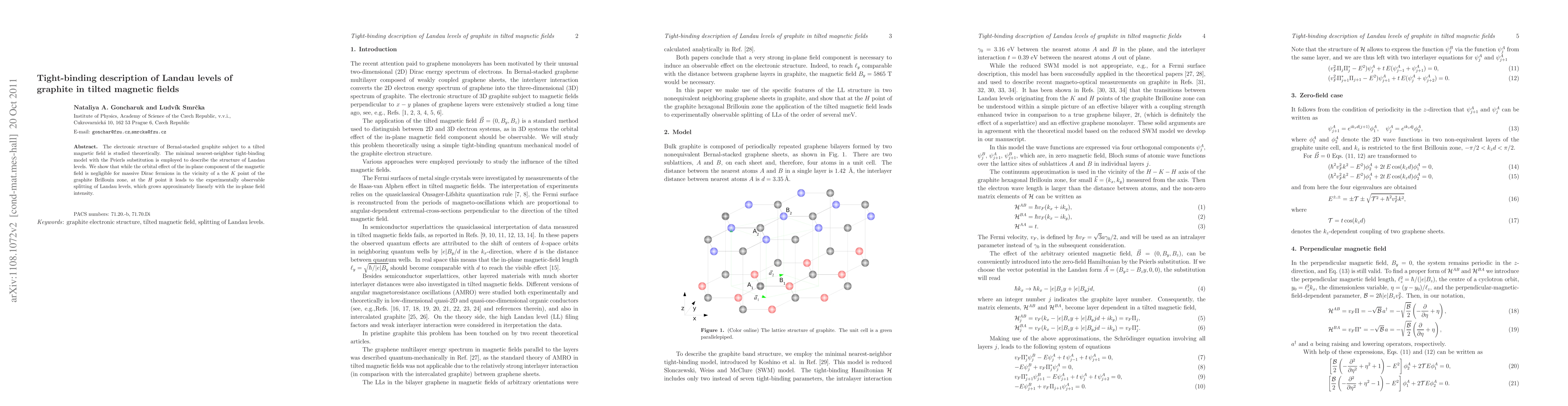 This paper theoretically investigates the electronic structure of graphite under tilted magnetic fields using a tight-binding model. It finds that while the in-plane magnetic field has minimal effect near the K point, it causes a linear splitting of Landau levels near the H point, observable in experiments.