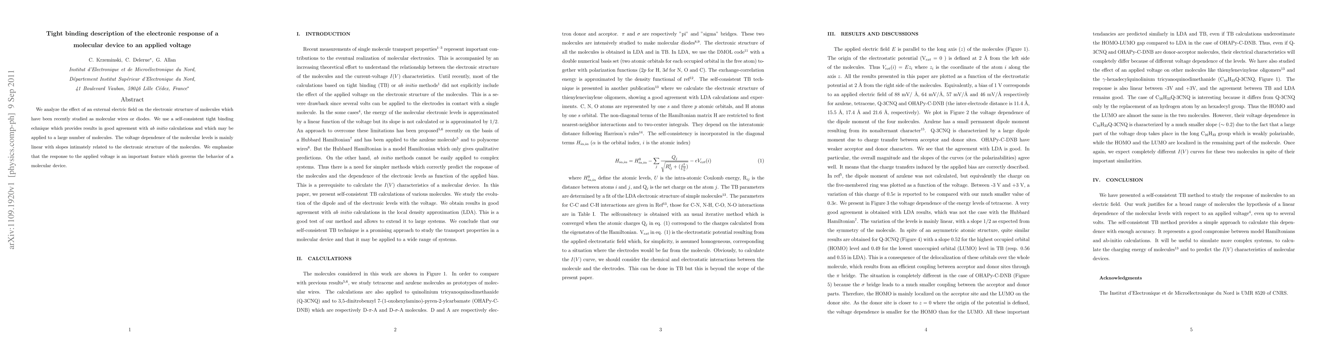 We analyze the effect of an external electric field on the electronic structure of molecules which have been recently studied as molecular wires or diodes. We use a self-consistent tight binding technique which provides results in good agreement with ab initio calculations and which may be applied to a large number of molecules. The voltage dependence of the molecular levels is mainly linear with slopes intimately related to the electronic structure of the molecules. We emphasize that the response to the applied voltage is an important feature which governs the behavior of a molecular device.