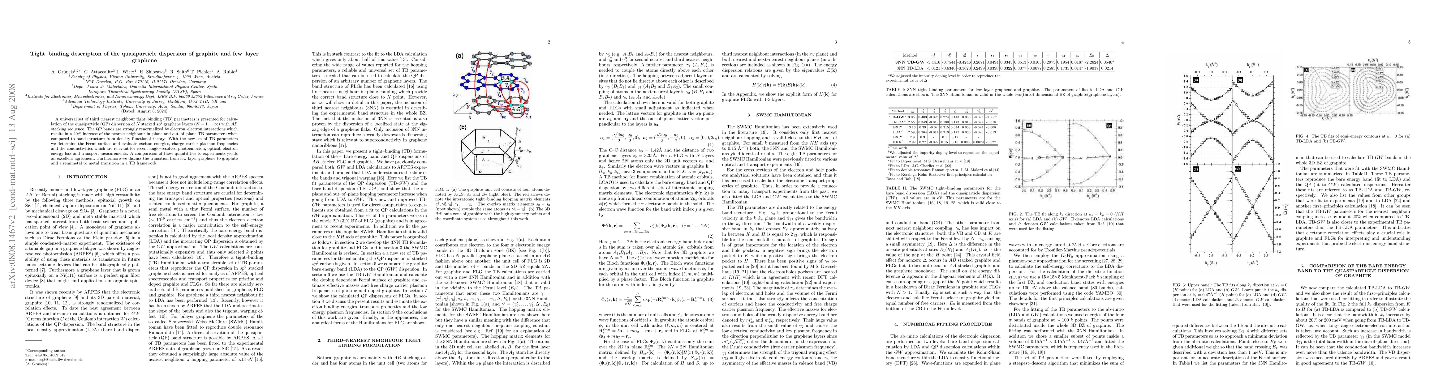 A universal set of third--nearest neighbour tight--binding (TB) parameters is presented for calculation of the quasiparticle (QP) dispersion of $N$ stacked $sp^2$ graphene layers ($N=1... \infty$) with $AB$ stacking sequence. The QP bands are strongly renormalized by electron--electron interactions which results in a 20% increase of the nearest neighbour in--plane and out--of--plane TB parameters when compared to band structure from density functional theory. With the new set of TB parameters we determine the Fermi surface and evaluate exciton energies, charge carrier plasmon frequencies and the conductivities which are relevant for recent angle--resolved photoemission, optical, electron energy loss and transport measurements. A comparision of these quantitities to experiments yields an excellent agreement. Furthermore we discuss the transition from few layer graphene to graphite and a semimetal to metal transition in a TB framework.