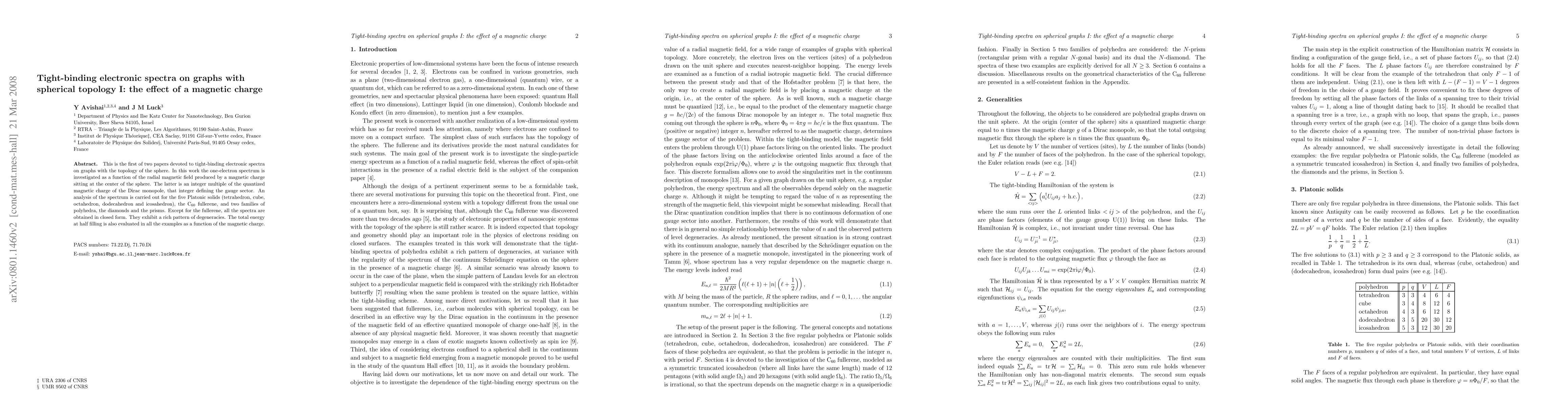 This is the first of two papers devoted to tight-binding electronic spectra on graphs with the topology of the sphere. In this work the one-electron spectrum is investigated as a function of the radial magnetic field produced by a magnetic charge sitting at the center of the sphere. The latter is an integer multiple of the quantized magnetic charge of the Dirac monopole, that integer defining the gauge sector. An analysis of the spectrum is carried out for the five Platonic solids (tetrahedron, cube, octahedron, dodecahedron and icosahedron), the C$_{60}$ fullerene, and two families of polyhedra, the diamonds and the prisms. Except for the fullerene, all the spectra are obtained in closed form. They exhibit a rich pattern of degeneracies. The total energy at half filling is also evaluated in all the examples as a function of the magnetic charge.