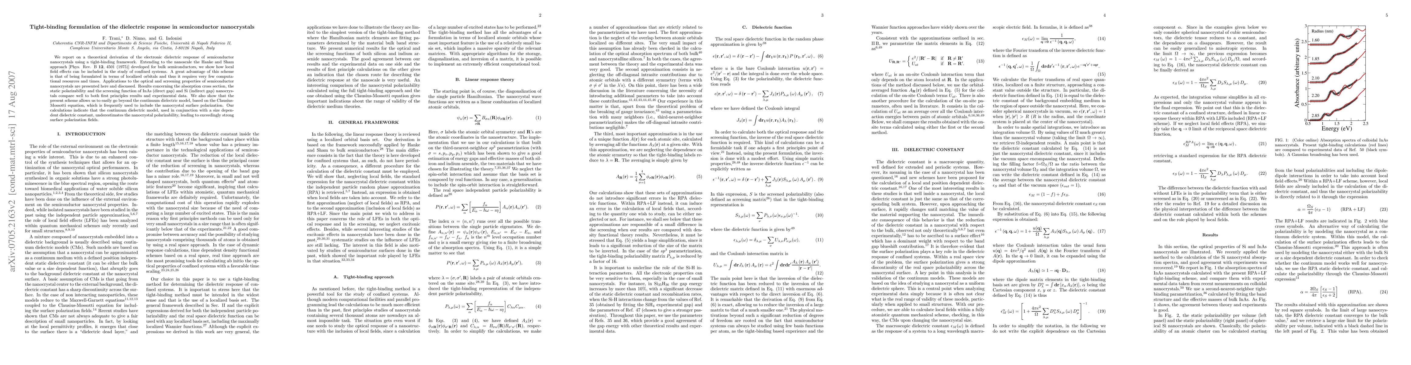 This paper presents a tight-binding theoretical framework for the dielectric response of semiconductor nanocrystals, extending the Hanke and Sham approach to nanoscale systems. The proposed method, formulated in terms of localized orbitals, provides accurate results for optical and screening properties, comparing well with first principles and experimental data.