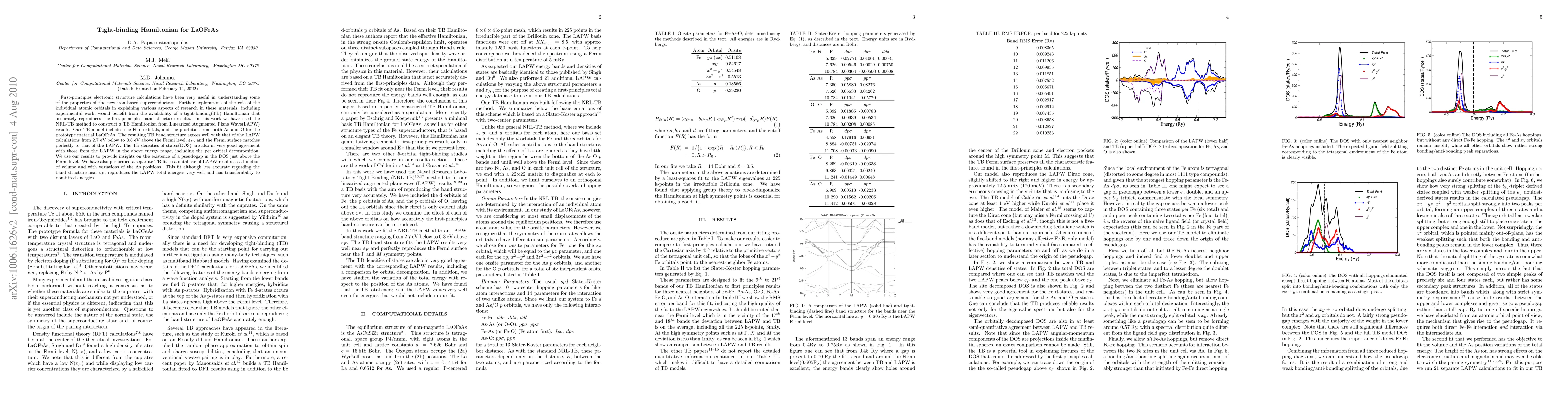 First-principles electronic structure calculations have been very useful in understanding some of the properties of the new iron-based superconductors. Further explorations of the role of the individual atomic orbitals in explaining various aspects of research in these materials, including experimental work, would benefit from the availability of a tight-binding(TB) Hamiltonian that reproduces accurately the first-principles band structure results. In this work we have used the NRL-TB method to construct a TB Hamiltonian from Linearized Augmented Plane Wave(LAPW) results. Our TB model includes the Fe d-orbitals, and the p-orbitals from both As and O for the prototype material LaOFeAs. The resulting TB band structure agrees well with that of the LAPW calculations in from 2.7 eV below to 0.8 eV above the Fermi level, epsilon_F, and the Fermi surface matches perfectly to that of the LAPW. The TB densities of states(DOS) are also in very good agreement with those from the LAPW in the above energy range, including the per orbital decomposition. We use our results to provide insights on the existence of a pseudogap in the DOS just above the Fermi level. We have also performed a separate TB fit to a database of LAPW results as a function of volume and with variations of the As positions. This fit although less accurate regarding the band structure near epsilon_F, reproduces the LAPW total energies very well and has transferability to non-fitted energies.