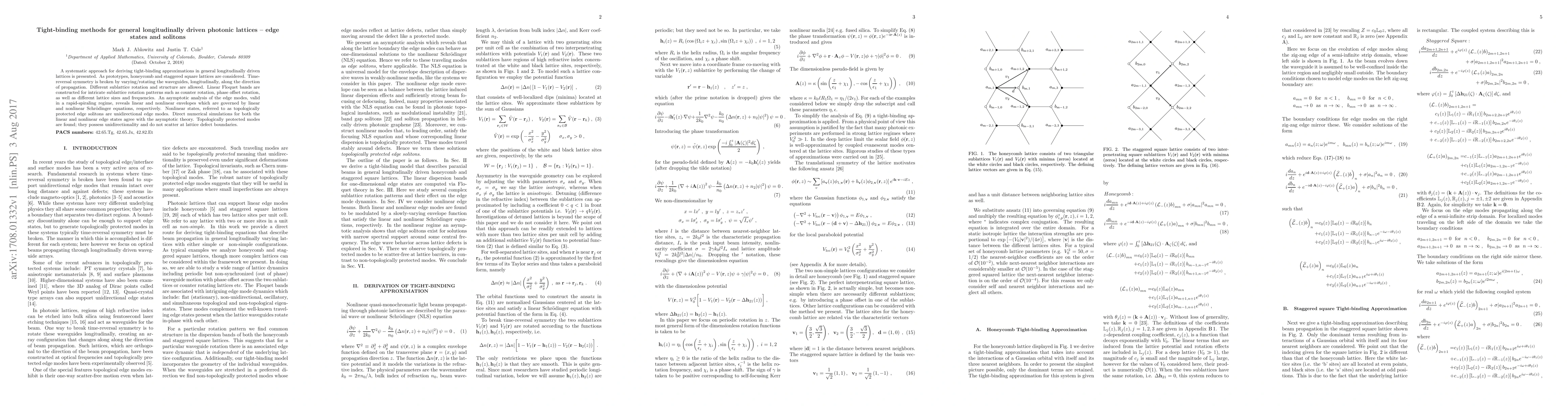This paper develops tight-binding approximations for longitudinally driven photonic lattices, focusing on honeycomb and staggered square lattices. It reveals linear and nonlinear edge states, including topologically protected solitons, validated by numerical simulations.