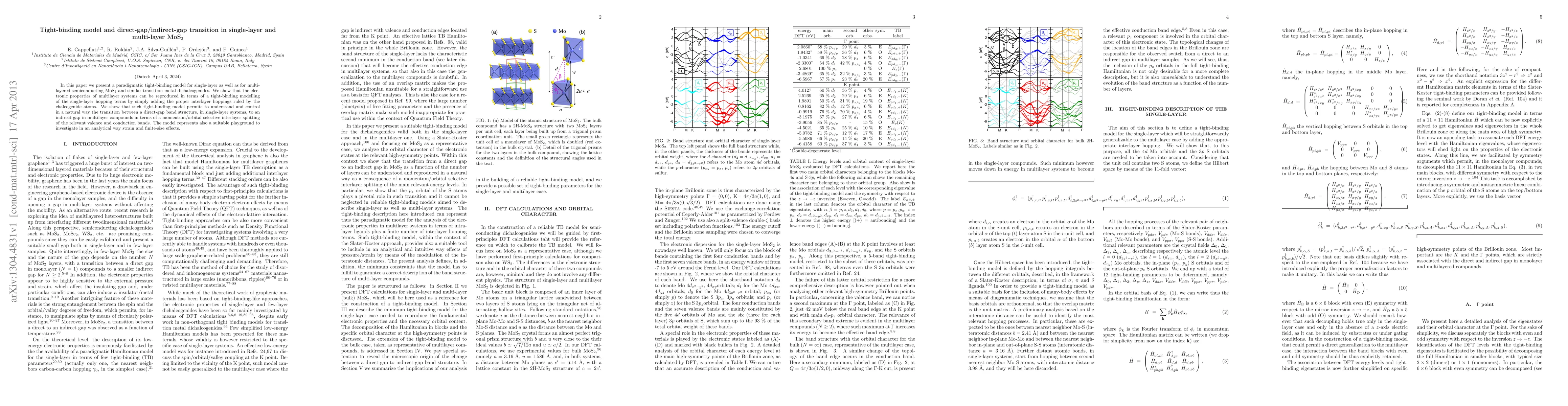 This paper develops a tight-binding model for single-layer and multi-layer MoS$_2$ that explains the transition from direct-gap to indirect-gap behavior with interlayer hopping terms. The model effectively captures strain and finite-size effects in transition metal dichalcogenides.
