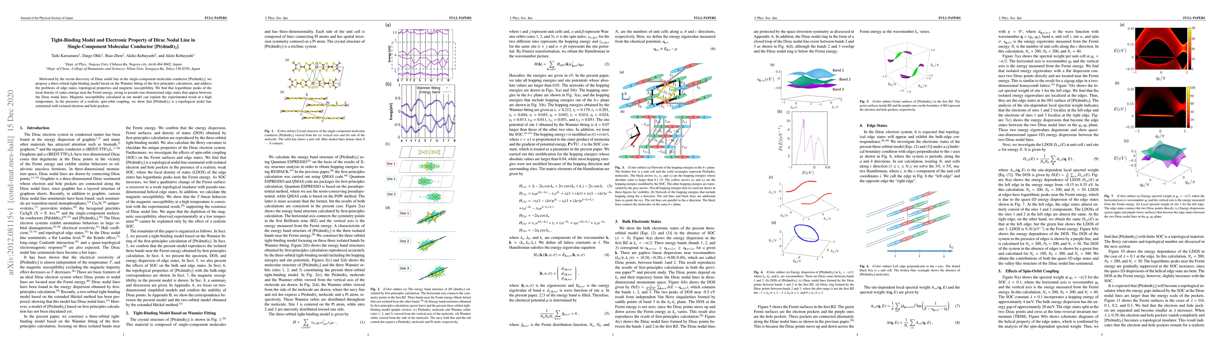 Motivated by the recent discovery of Dirac nodal line in the single-component molecular conductor [Pt(dmdt)$_{2}$], we propose a three-orbital tight-binding model based on the Wannier fitting of the first-principles calculation, and address the problems of edge states, topological properties and magnetic susceptibility. We find that logarithmic peaks of the local density of states emerge near the Fermi energy, owing to pseudo-one-dimensional edge states that appear between the Dirac nodal lines. Magnetic susceptibility calculated in our model can explain the experimental result at a high temperature. In the presence of a realistic spin-orbit coupling, we show that [Pt(dmdt)$_{2}$] is a topological nodal line semimetal with isolated electron and hole pockets.