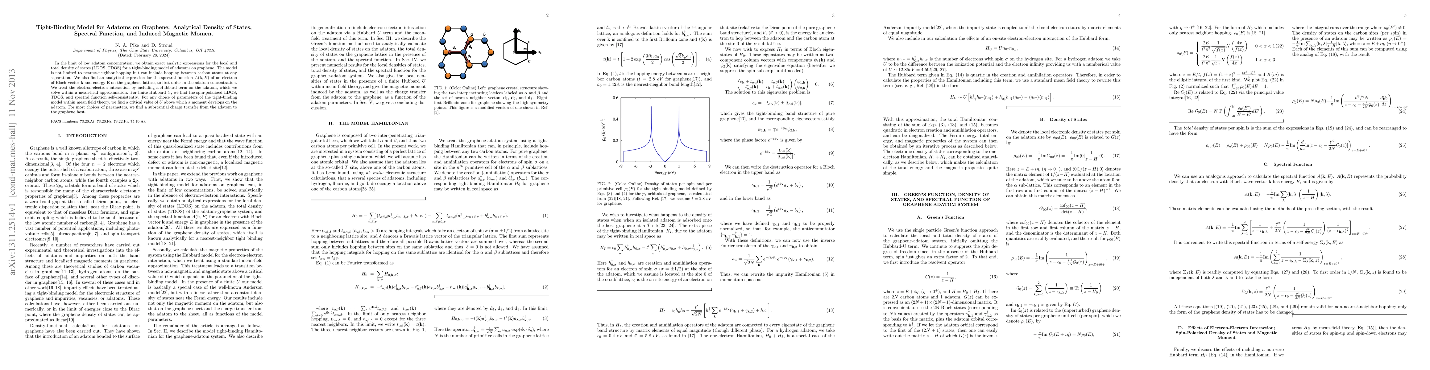 This paper presents analytical expressions for the density of states and spectral function of adatoms on graphene within a tight-binding model, including electron-electron interactions via a Hubbard term. It finds a critical Hubbard parameter above which adatoms develop a magnetic moment, with significant charge transfer from adatoms to graphene for most parameter choices.