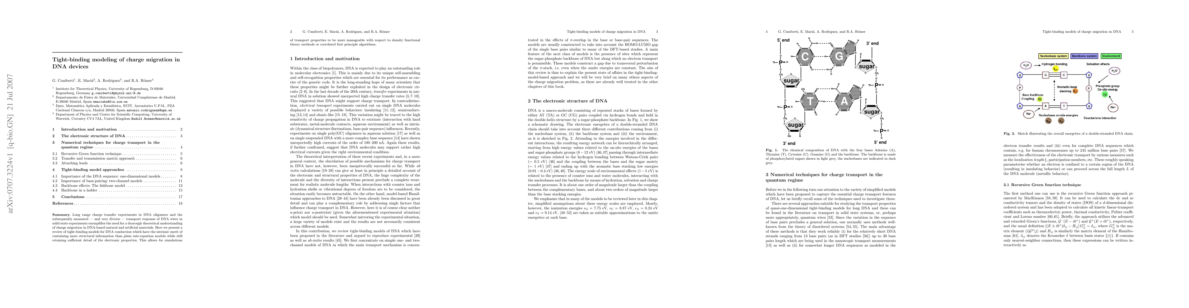This paper reviews tight-binding models for DNA conduction, emphasizing their ability to incorporate structural information and electronic properties to simulate charge migration in DNA devices more efficiently than first-principles methods. These models bridge the gap between rate-equation models and complex quantum mechanical simulations.