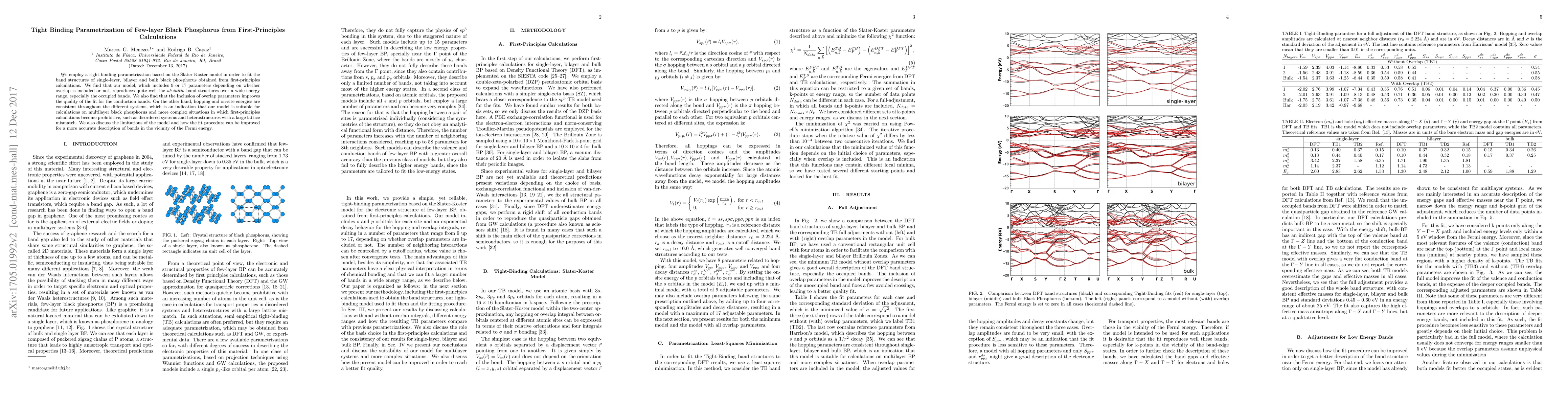 This paper develops a tight-binding model for few-layer black phosphorus, fitting it to first-principles calculations. The model, with 9 or 17 parameters, accurately reproduces the ab-initio band structures, especially occupied bands, and is suitable for complex multilayer and disordered systems.
