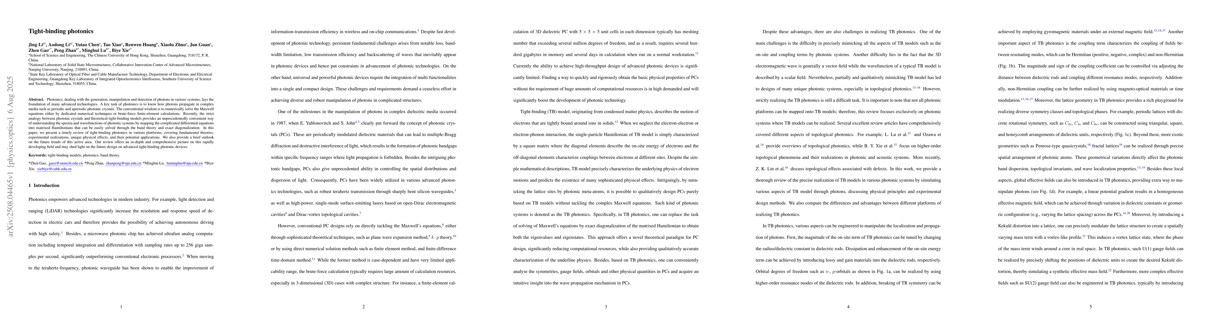 This paper reviews the application of tight-binding models in photonics, offering a simplified method to understand photon behavior in complex media. It covers theoretical foundations, experimental implementations, unique effects, and future trends, providing a comprehensive overview for designing advanced photonic devices.