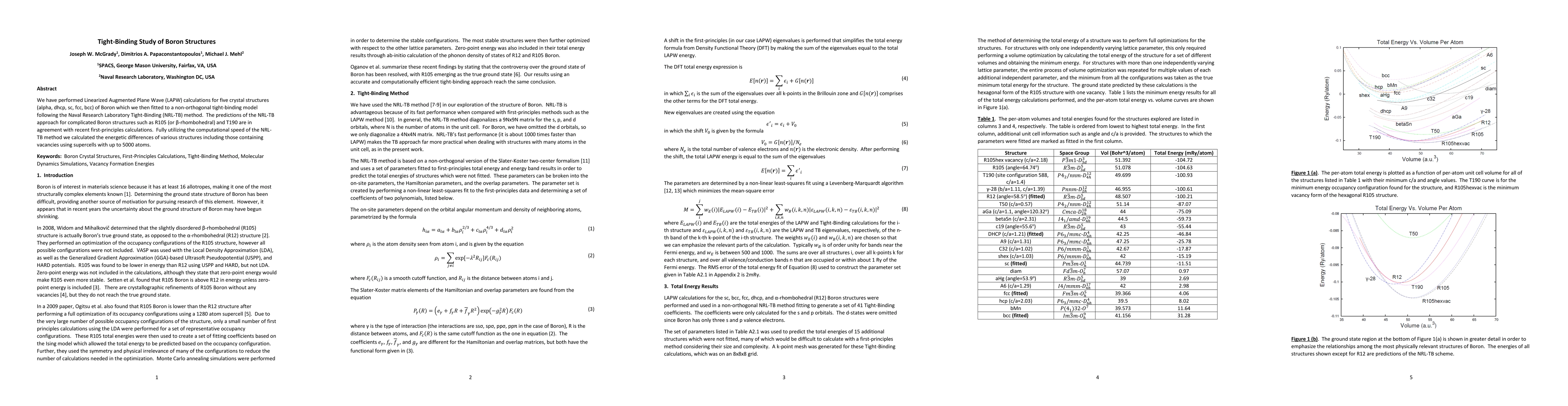 We have performed Linearized Augmented Plane Wave (LAPW) calculations for five crystal structures (alpha, dhcp, sc, fcc, bcc) of Boron which we then fitted to a non-orthogonal tight-binding model following the Naval Research Laboratory Tight-Binding (NRL-TB) method. The predictions of the NRL-TB approach for complicated Boron structures such as R105 (or \b{eta}-rhombohedral) and T190 are in agreement with recent first-principles calculations. Fully utilizing the computational speed of the NRL-TB method we calculated the energetic differences of various structures including those containing vacancies using supercells with up to 5000 atoms.