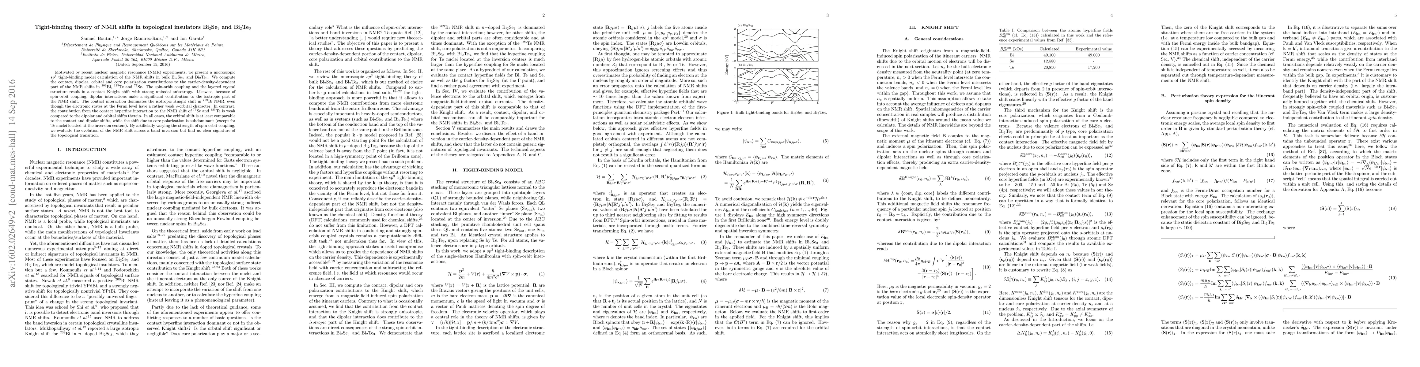 Motivated by recent nuclear magnetic resonance (NMR) experiments, we present a microscopic sp3 tight-binding model calculation of the NMR shifts in bulk Bi2Se3, and Bi2Te3. We compute the contact, dipolar, orbital and core polarization contributions to the carrier-density-dependent part of the NMR shifts in Bi209, Te125 and Se77. The spin-orbit coupling and the layered crystal structure result in a contact Knight shift with strong uniaxial anisotropy. Likewise, because of spin-orbit coupling, dipolar interactions make a significant contribution to the isotropic part of the NMR shift. The contact interaction dominates the isotropic Knight shift in Bi209 NMR, even though the electronic states at the Fermi level have a rather weak s-orbital character. In contrast, the contribution from the contact hyperfine interaction to the NMR shift of Se77 and Te125 is weak compared to the dipolar and orbital shifts therein. In all cases, the orbital shift is at least comparable to the contact and dipolar shifts, while the shift due to core polarization is subdominant (except for Te nuclei located at the inversion centers). By artificially varying the strength of spin-orbit coupling, we evaluate the evolution of the NMR shift across a band inversion but find no clear signature of the topological transition.