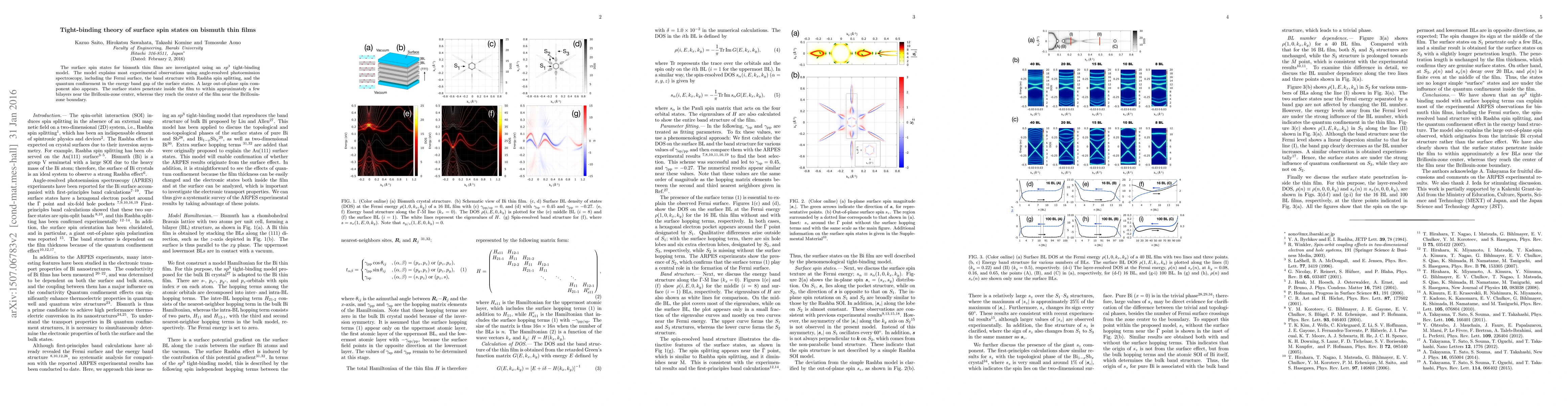 The surface spin states for bismuth thin films were investigated using an $sp^3$ tight-binding model. The model explains the experimental observations using angle-resolved photoemission spectroscopy, including the Fermi surface, the band structure with Rashba spin splitting, and the quantum confinement in the energy band gap of the surface states. A large out-of-plane spin component also appears. The surface states penetrate inside the film to within approximately a few bilayers near the Brillouin-zone center, whereas they reach the center of the film near the Brillouin-zone boundary.