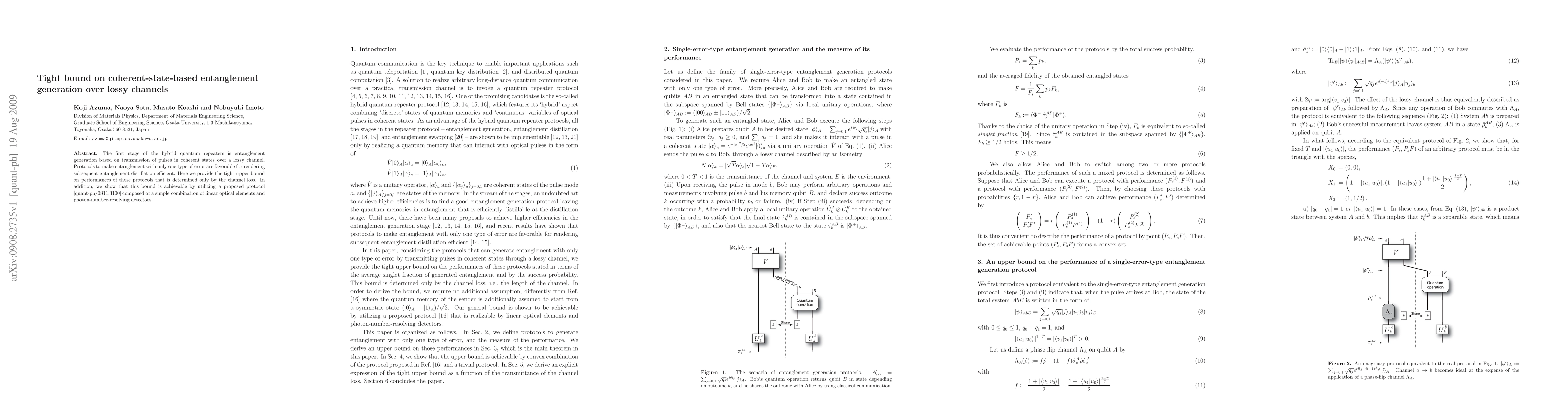 This paper establishes a tight upper bound on the efficiency of entanglement generation using coherent states over lossy channels, demonstrating that the bound is solely determined by channel loss. It also proposes a protocol utilizing linear optical elements and photon-number-resolving detectors that achieves this bound.