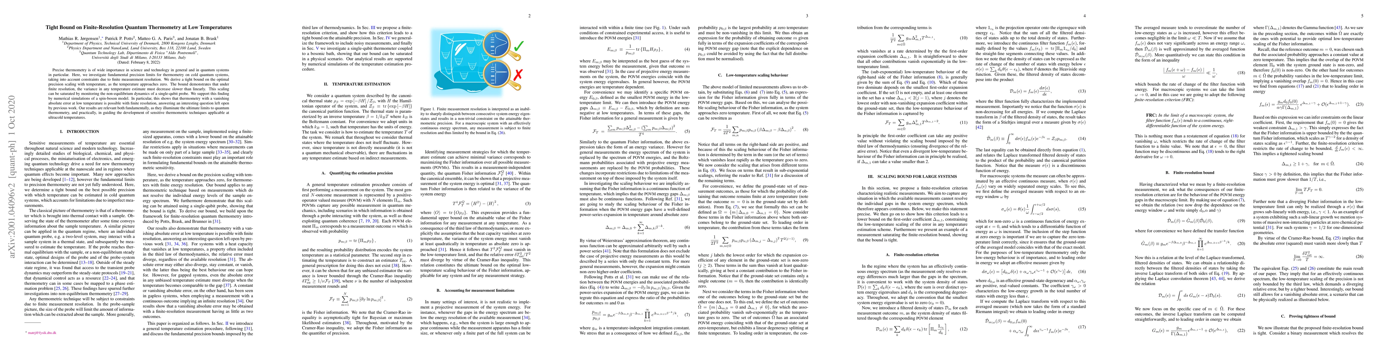 This paper establishes a tight bound on the precision limits for quantum thermometry at low temperatures, considering finite measurement resolution. The derived bound is achievable through monitoring non-equilibrium dynamics of a single-qubit probe, supported by numerical simulations of a spin-boson model, with implications for both fundamental quantum physics and practical thermometric techniques.