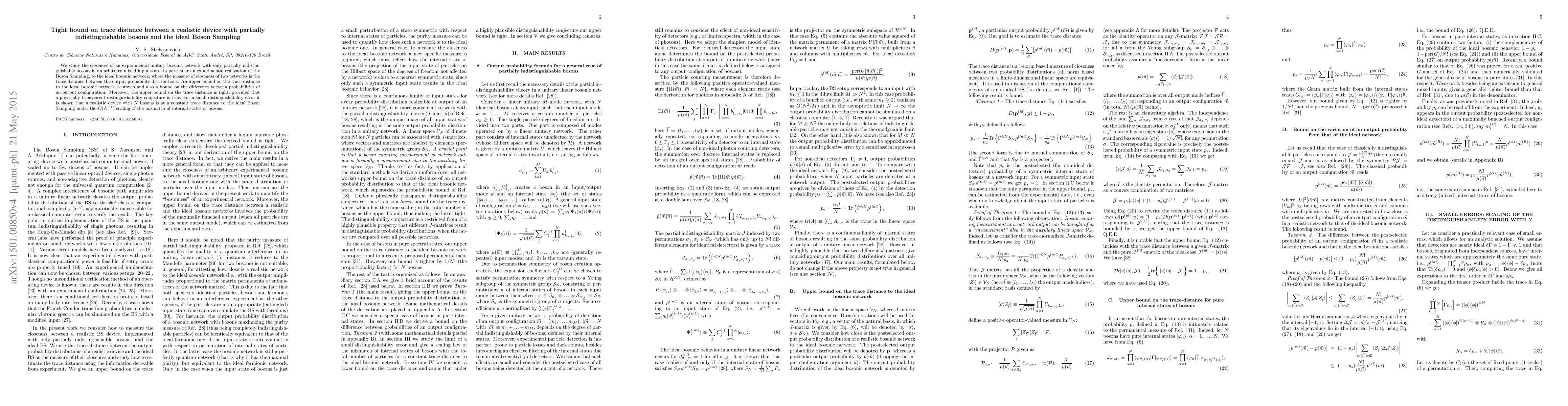 We study the closeness of an experimental unitary bosonic network with only partially indistinguishable bosons in an arbitrary mixed input state, in particular an experimental realization of the Boson Sampling, to the ideal bosonic network, where the measure of closeness of two networks is the trace distance between the output probability distributions. An upper bound on the trace distance to the ideal bosonic network is proven and also a bound on the difference between probabilities of an output configuration. Moreover, the upper bound on the trace distance is tight, provided that a physically transparent distinguishability conjecture is true. For a small distinguishability error it is shown that a realistic device with $N$ bosons is at a constant trace distance to the ideal Boson Sampling under the $O(N^{-1})$-scaling of the mismatch of internal states of bosons.