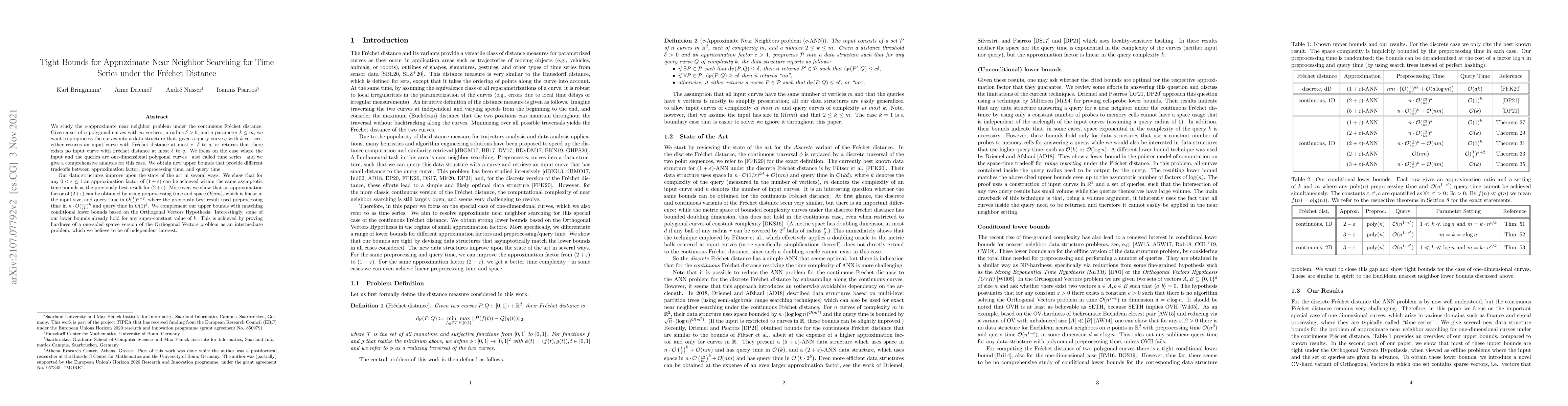 This paper presents new upper bounds for the $c$-approximate near neighbor searching problem for time series under the Fréchet distance, achieving better tradeoffs between approximation factor, preprocessing time, and query time. The authors also provide matching lower bounds based on the Orthogonal Vectors Hypothesis, highlighting the optimality of their results.