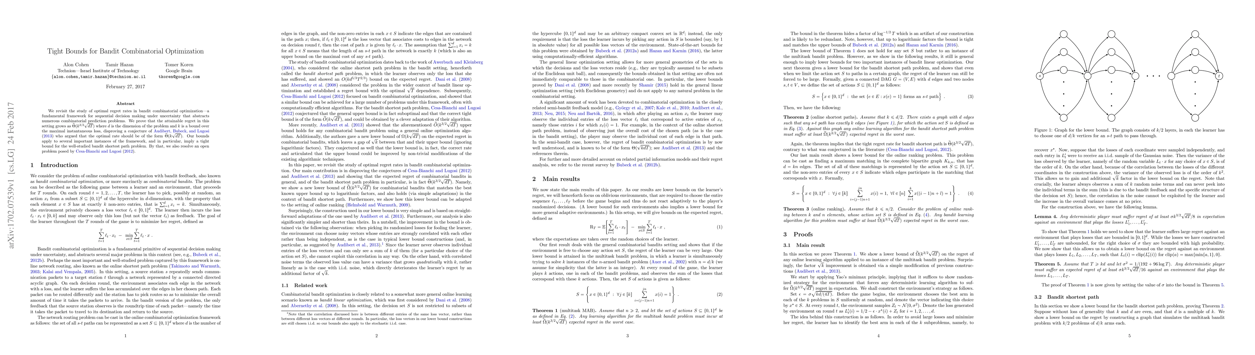 This paper establishes tight regret bounds for bandit combinatorial optimization, proving that the optimal regret rate is $\widetilde{\Theta}(k^{3/2}\sqrt{dT})$, which disproves a previous conjecture suggesting $\widetilde{\Theta}(k\sqrt{dT})$. This result applies to various instances, including the bandit shortest path problem.