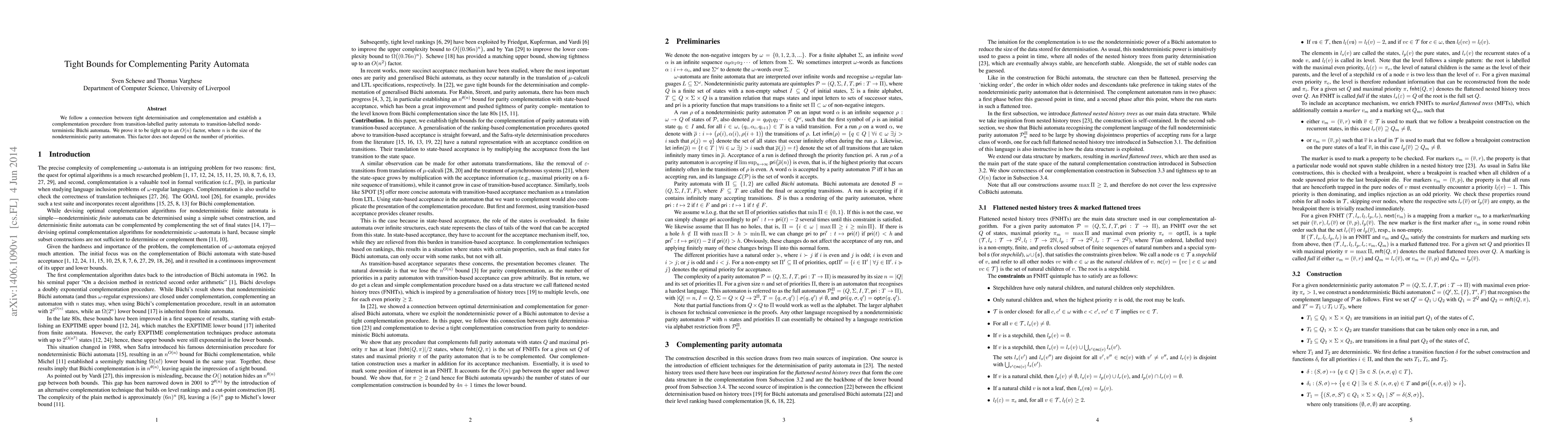 This paper establishes a complementation procedure from parity automata to nondeterministic Büchi automata, proving it to be tight up to an $O(n)$ factor, where $n$ is the automaton size, independent of the number of priorities. The method connects tight determinization with complementation.