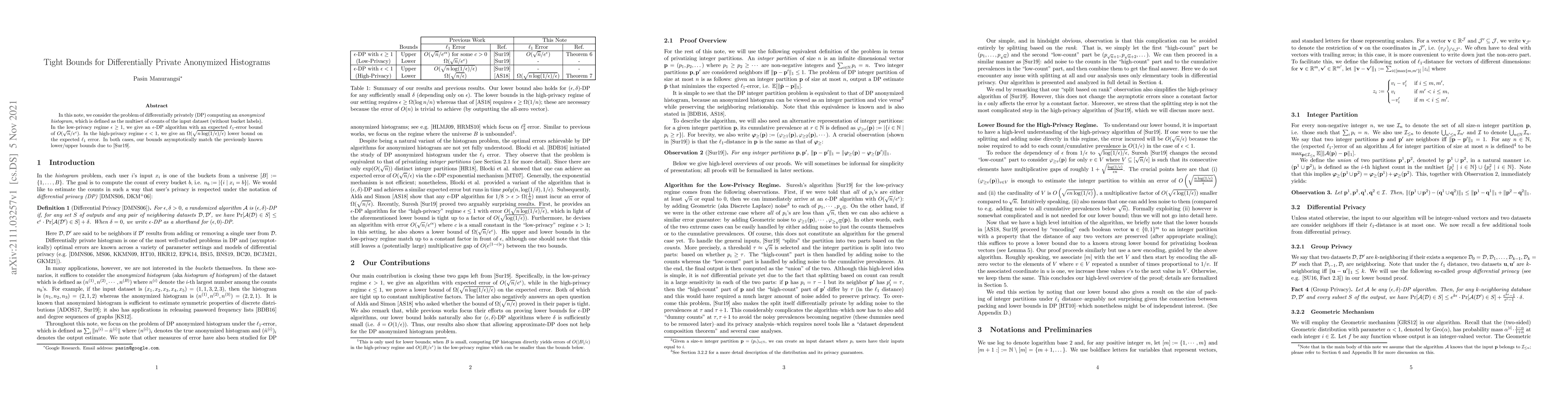 In this note, we consider the problem of differentially privately (DP) computing an anonymized histogram, which is defined as the multiset of counts of the input dataset (without bucket labels). In the low-privacy regime $\epsilon \geq 1$, we give an $\epsilon$-DP algorithm with an expected $\ell_1$-error bound of $O(\sqrt{n} / e^\epsilon)$. In the high-privacy regime $\epsilon < 1$, we give an $\Omega(\sqrt{n \log(1/\epsilon) / \epsilon})$ lower bound on the expected $\ell_1$ error. In both cases, our bounds asymptotically match the previously known lower/upper bounds due to [Suresh, NeurIPS 2019].