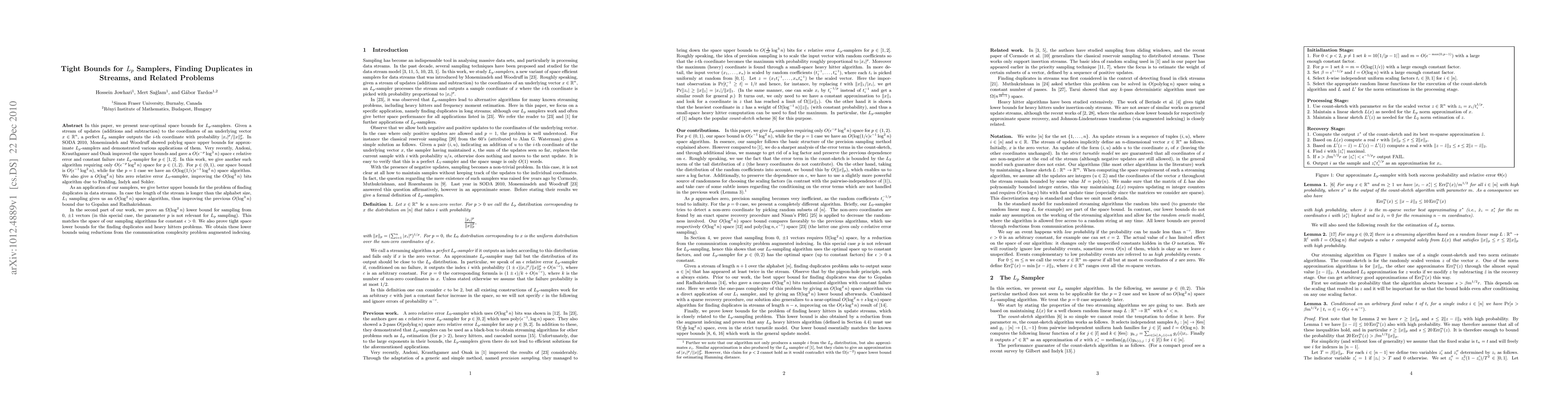 In this paper, we present near-optimal space bounds for Lp-samplers. Given a stream of updates (additions and subtraction) to the coordinates of an underlying vector x \in R^n, a perfect Lp sampler outputs the i-th coordinate with probability |x_i|^p/||x||_p^p. In SODA 2010, Monemizadeh and Woodruff showed polylog space upper bounds for approximate Lp-samplers and demonstrated various applications of them. Very recently, Andoni, Krauthgamer and Onak improved the upper bounds and gave a O(\epsilon^{-p} log^3 n) space \epsilon relative error and constant failure rate Lp-sampler for p \in [1,2]. In this work, we give another such algorithm requiring only O(\epsilon^{-p} log^2 n) space for p \in (1,2). For p \in (0,1), our space bound is O(\epsilon^{-1} log^2 n), while for the $p=1$ case we have an O(log(1/\epsilon)\epsilon^{-1} log^2 n) space algorithm. We also give a O(log^2 n) bits zero relative error L0-sampler, improving the O(log^3 n) bits algorithm due to Frahling, Indyk and Sohler. As an application of our samplers, we give better upper bounds for the problem of finding duplicates in data streams. In case the length of the stream is longer than the alphabet size, L1 sampling gives us an O(log^2 n) space algorithm, thus improving the previous O(log^3 n) bound due to Gopalan and Radhakrishnan. In the second part of our work, we prove an Omega(log^2 n) lower bound for sampling from 0, \pm 1 vectors (in this special case, the parameter p is not relevant for Lp sampling). This matches the space of our sampling algorithms for constant \epsilon > 0. We also prove tight space lower bounds for the finding duplicates and heavy hitters problems. We obtain these lower bounds using reductions from the communication complexity problem augmented indexing.