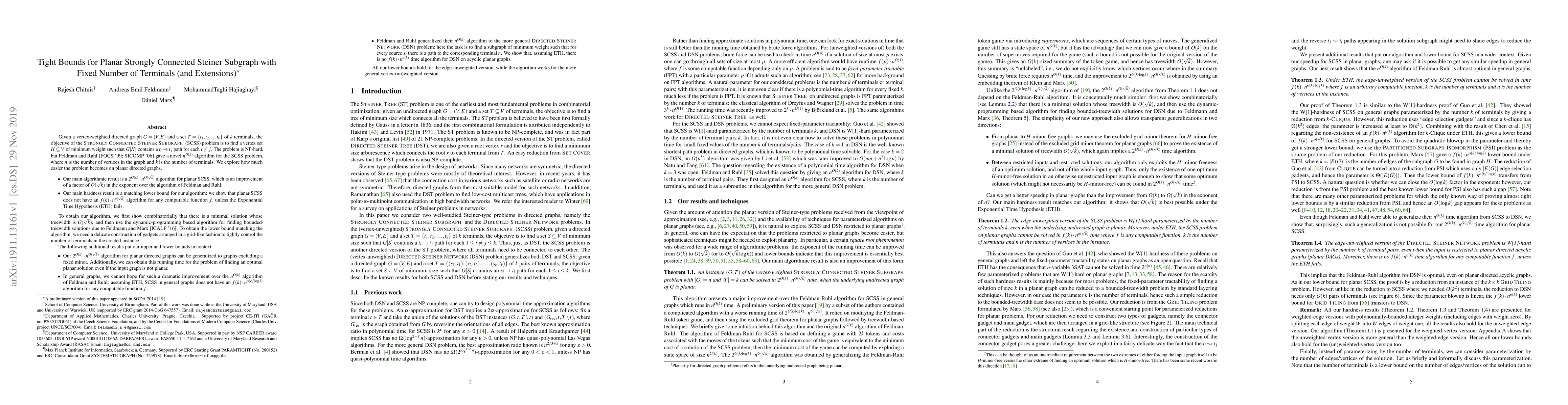 (see paper for full abstract) Given a vertex-weighted directed graph $G=(V,E)$ and a set $T=\{t_1, t_2, \ldots t_k\}$ of $k$ terminals, the objective of the SCSS problem is to find a vertex set $H\subseteq V$ of minimum weight such that $G[H]$ contains a $t_{i}\rightarrow t_j$ path for each $i\neq j$. The problem is NP-hard, but Feldman and Ruhl [FOCS '99; SICOMP '06] gave a novel $n^{O(k)}$ algorithm for the SCSS problem, where $n$ is the number of vertices in the graph and $k$ is the number of terminals. We explore how much easier the problem becomes on planar directed graphs: - Our main algorithmic result is a $2^{O(k)}\cdot n^{O(\sqrt{k})}$ algorithm for planar SCSS, which is an improvement of a factor of $O(\sqrt{k})$ in the exponent over the algorithm of Feldman and Ruhl. - Our main hardness result is a matching lower bound for our algorithm: we show that planar SCSS does not have an $f(k)\cdot n^{o(\sqrt{k})}$ algorithm for any computable function $f$, unless the Exponential Time Hypothesis (ETH) fails. The following additional results put our upper and lower bounds in context: - In general graphs, we cannot hope for such a dramatic improvement over the $n^{O(k)}$ algorithm of Feldman and Ruhl: assuming ETH, SCSS in general graphs does not have an $f(k)\cdot n^{o(k/\log k)}$ algorithm for any computable function $f$. - Feldman and Ruhl generalized their $n^{O(k)}$ algorithm to the more general Directed Steiner Network (DSN) problem; here the task is to find a subgraph of minimum weight such that for every source $s_i$ there is a path to the corresponding terminal $t_i$. We show that, assuming ETH, there is no $f(k)\cdot n^{o(k)}$ time algorithm for DSN on acyclic planar graphs.