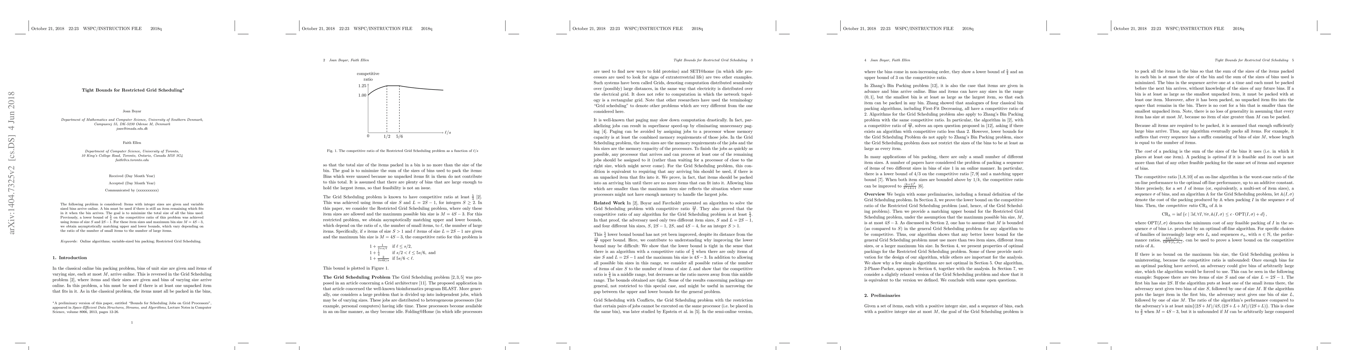 Researchers have established tight bounds for a restricted grid scheduling problem, achieving asymptotically matching upper and lower bounds that depend on the ratio of small to large jobs. The competitive ratio is improved upon previously reported 5/4 bound.