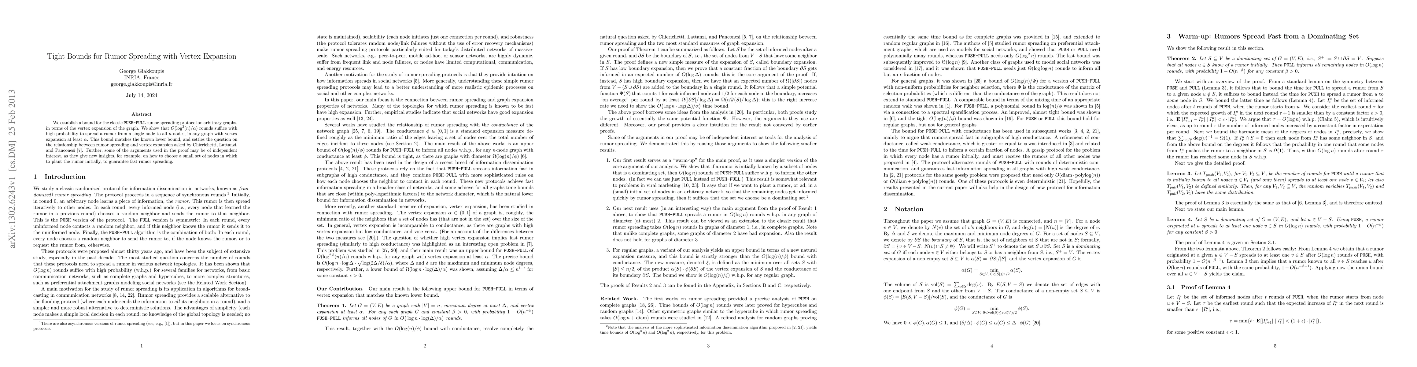 This paper establishes that O(log^2(n)/\alpha) rounds are sufficient for rumor spreading via the PUSH-PULL protocol in graphs with vertex expansion at least α, matching known lower bounds and resolving the relationship between rumor spreading and vertex expansion. The findings also provide insights into selecting initial nodes for rumor planting.
