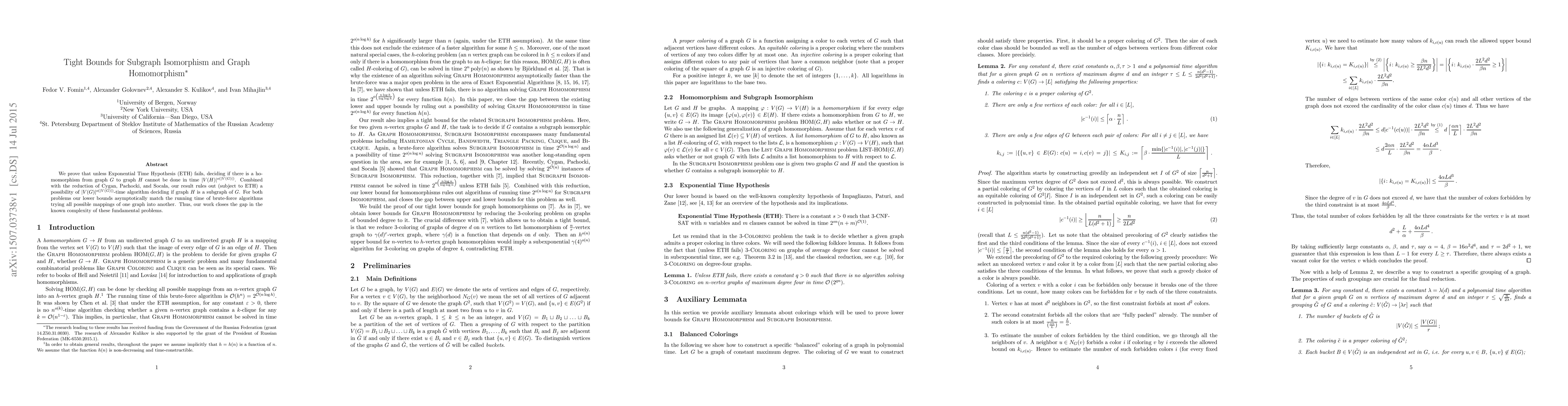 This paper establishes tight lower bounds for the Graph Homomorphism and Subgraph Isomorphism problems, showing that no $|V(H)|^{o(|V(G)|)}$-time algorithm exists unless the Exponential Time Hypothesis fails. The results close the complexity gap for these fundamental problems.