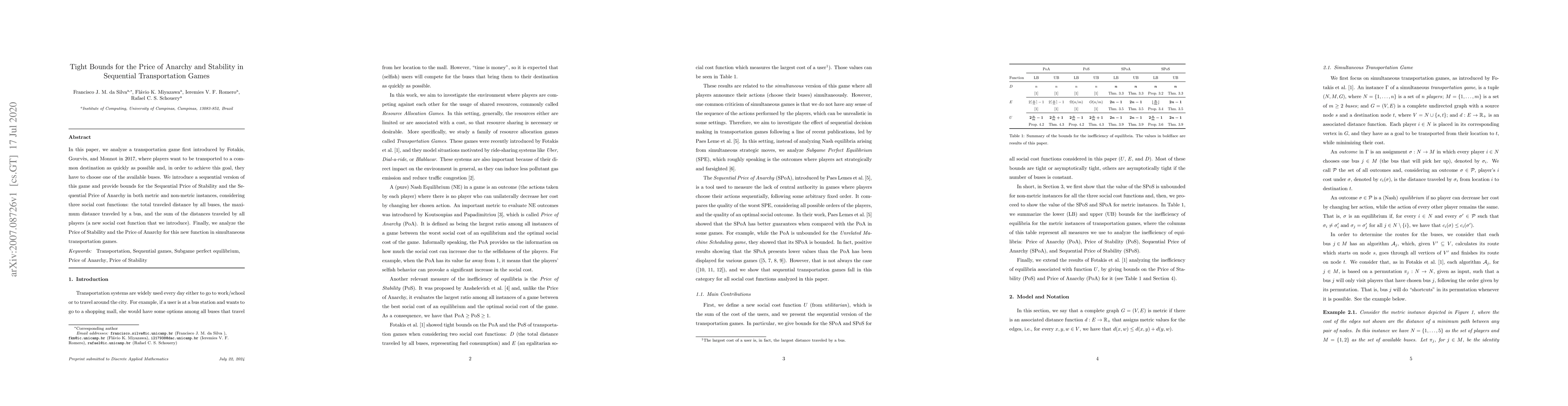This paper explores a sequential transportation game where players choose buses to reach a common destination quickly. It provides tight bounds for the Sequential Price of Stability and Anarchy under various social cost functions, including a newly introduced one, and analyzes these metrics in both metric and non-metric instances.