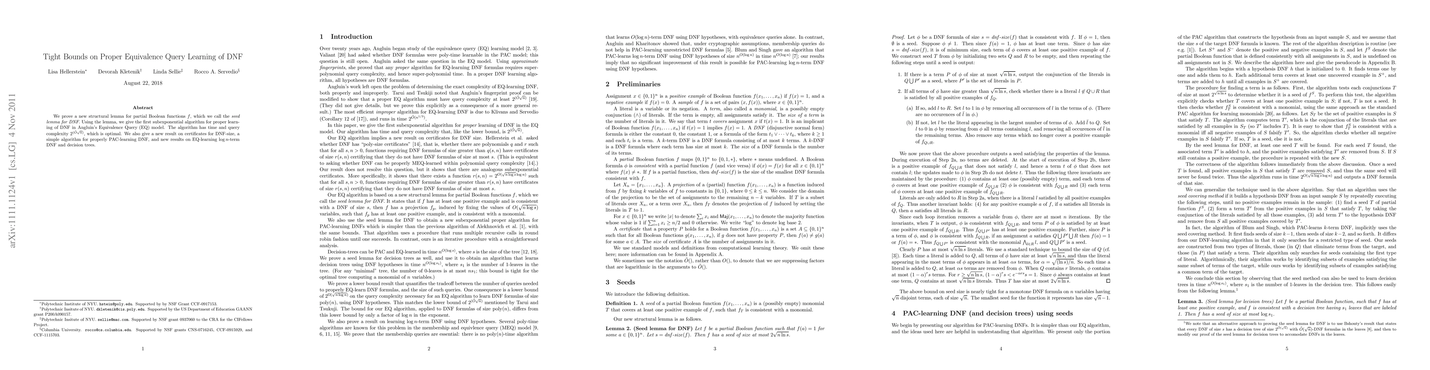 This paper presents a new structural lemma, the seed lemma for DNF, which enables the first subexponential algorithm for proper learning of DNF in Angluin's EQ model, achieving optimal time and query complexity of $2^{(\tilde{O}{\sqrt{n}})}$. It also introduces results on certificates for DNF-size and proper PAC-learning.