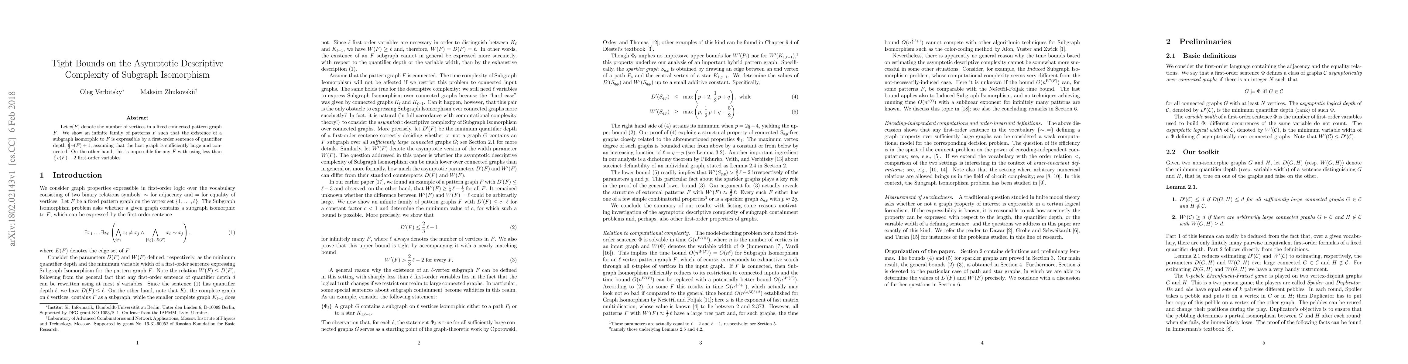 Let $v(F)$ denote the number of vertices in a fixed connected pattern graph $F$. We show an infinite family of patterns $F$ such that the existence of a subgraph isomorphic to $F$ is expressible by a first-order sentence of quantifier depth $\frac23\,v(F)+1$, assuming that the host graph is sufficiently large and connected. On the other hand, this is impossible for any $F$ with using less than $\frac23\,v(F)-2$ first-order variables.