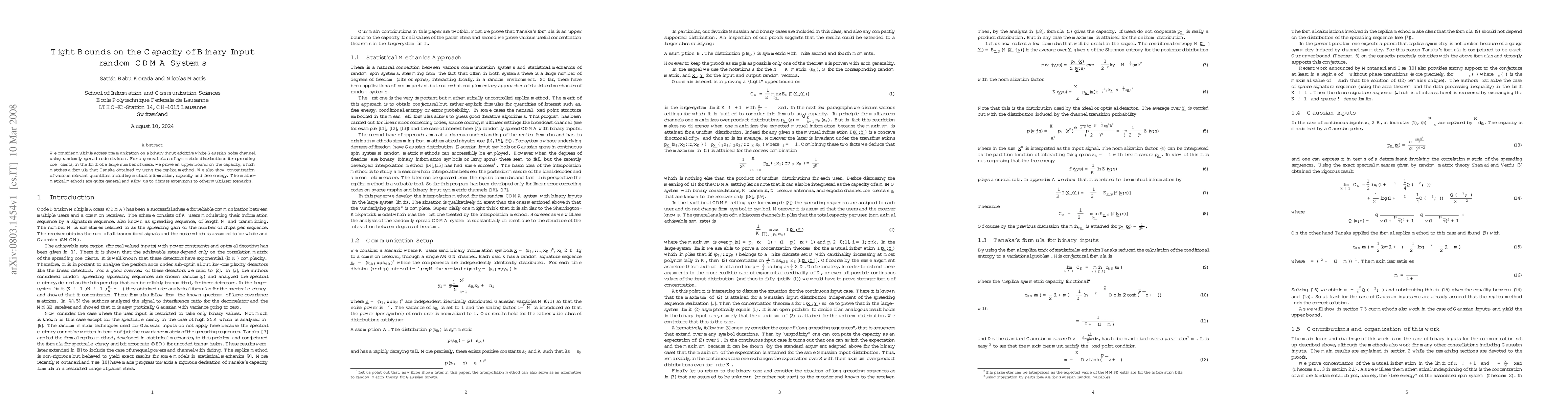 Researchers have found tight bounds on the capacity of binary input CDMA systems, matching a previously obtained formula using the replica method. Their general approach can be applied to other multiuser scenarios.