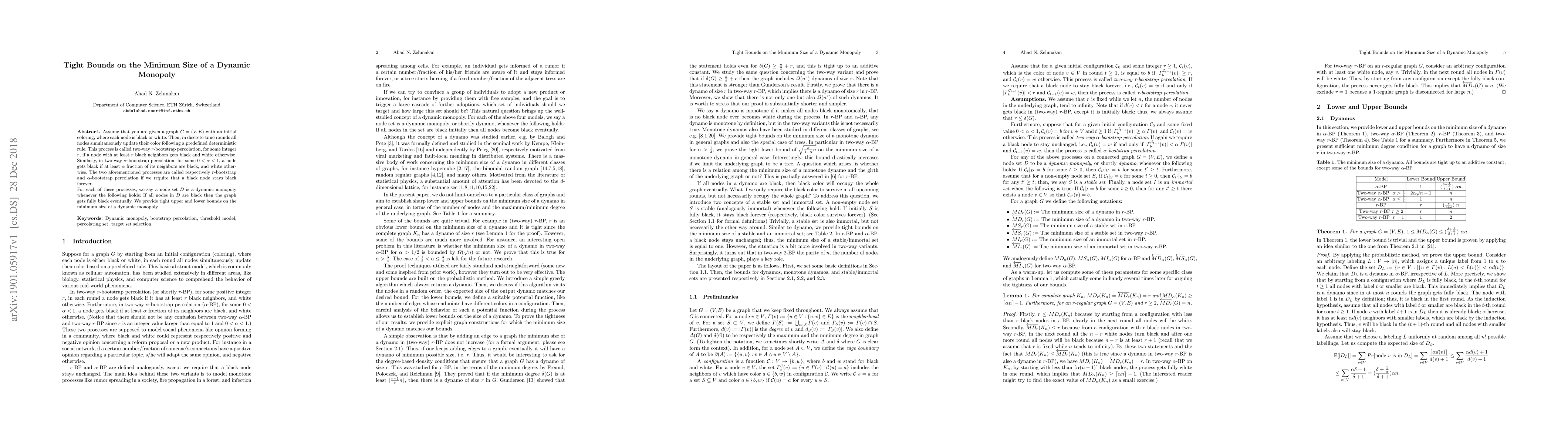 Assume that you are given a graph $G=(V,E)$ with an initial coloring, where each node is black or white. Then, in discrete-time rounds all nodes simultaneously update their color following a predefined deterministic rule. This process is called two-way $r$-bootstrap percolation, for some integer $r$, if a node with at least $r$ black neighbors gets black and white otherwise. Similarly, in two-way $\alpha$-bootstrap percolation, for some $0<\alpha<1$, a node gets black if at least $\alpha$ fraction of its neighbors are black, and white otherwise. The two aforementioned processes are called respectively $r$-bootstrap and $\alpha$-bootstrap percolation if we require that a black node stays black forever. For each of these processes, we say a node set $D$ is a dynamic monopoly whenever the following holds: If all nodes in $D$ are black then the graph gets fully black eventually. We provide tight upper and lower bounds on the minimum size of a dynamic monopoly.