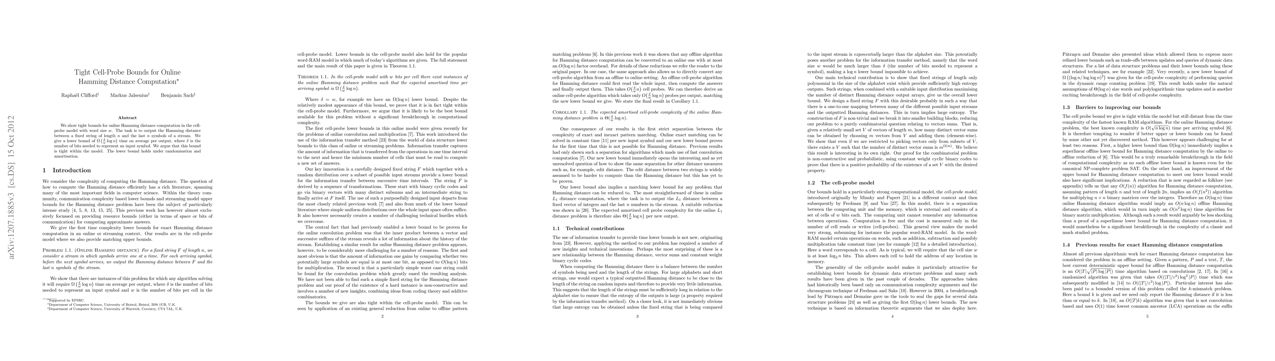This paper establishes tight cell-probe bounds for online Hamming distance computation, proving a lower bound of Ω((d/w)log n) for average time per output, where d is the bit representation size of input symbols and w is the word size. The authors argue that this bound is optimal within the cell-probe model, valid under randomization and amortization.